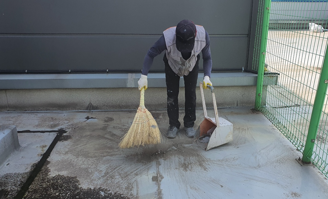 먼저 바닥을 정리해야 합니다. 간단하게 쓸어내어 먼지와 이물질 등을 제거하고 장애물이 있거나 작업에 방해가 될만한 것이 있으면 칼과 그라인더 등으로 최대한 없애줍니다.