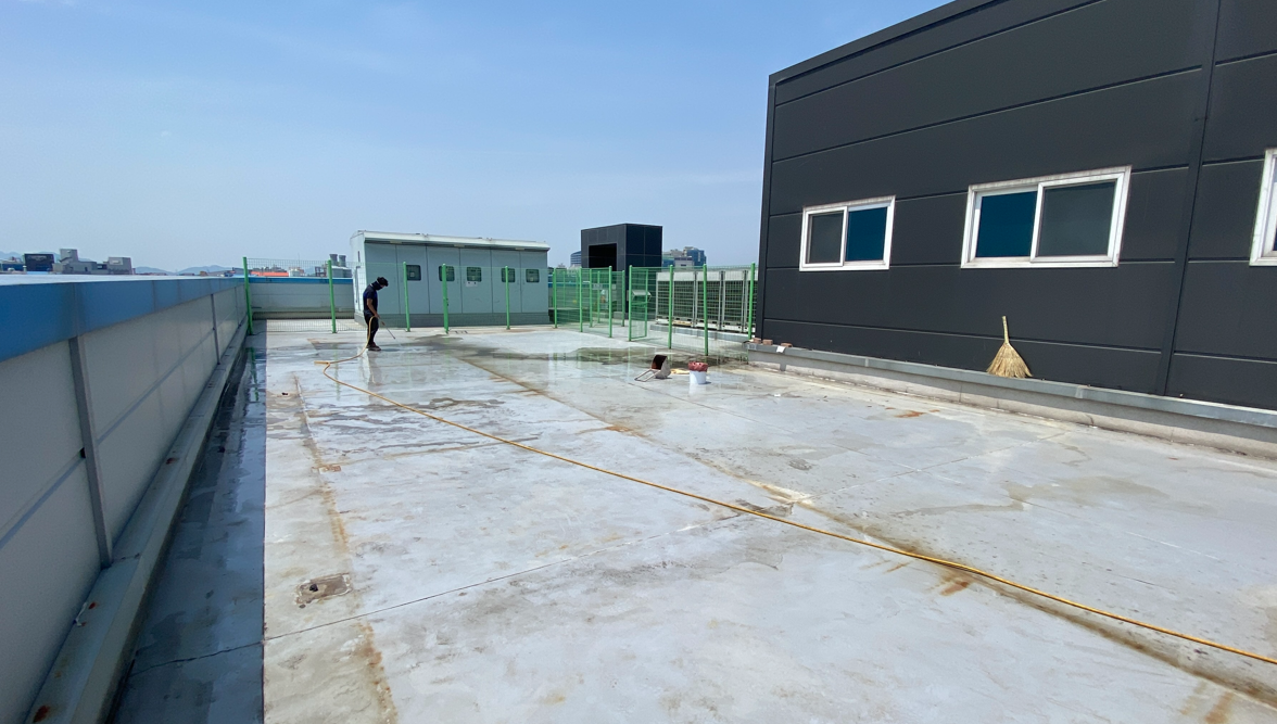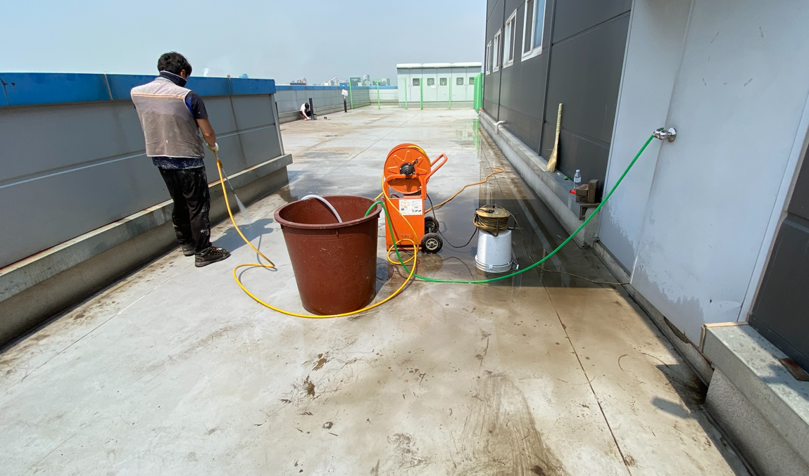 바닥을 간단히 정리한 후에는 고압 세척기로 물청소를 합니다. 두 작업 모두 앞으로의 작업을 원활하게 수행하기 위한 밑 작업으로 최대한 꼼꼼하게 작업합니다.