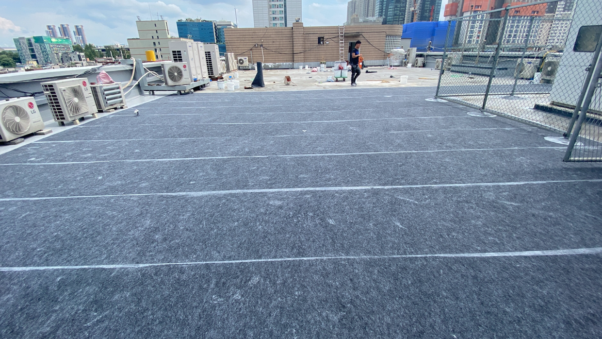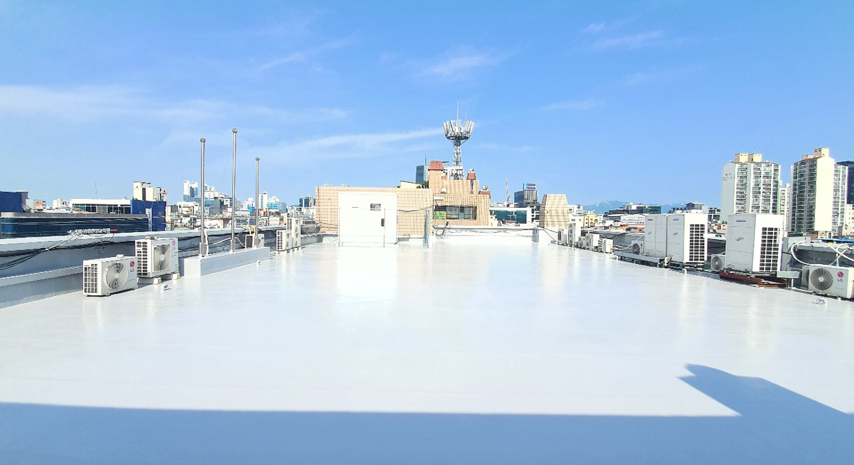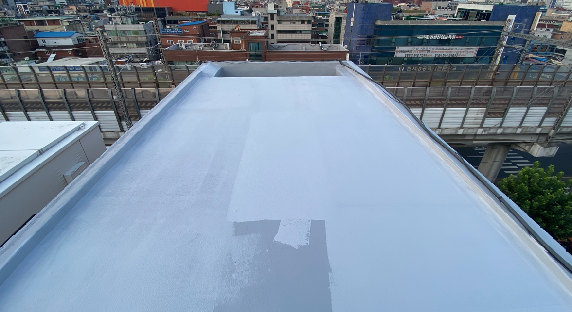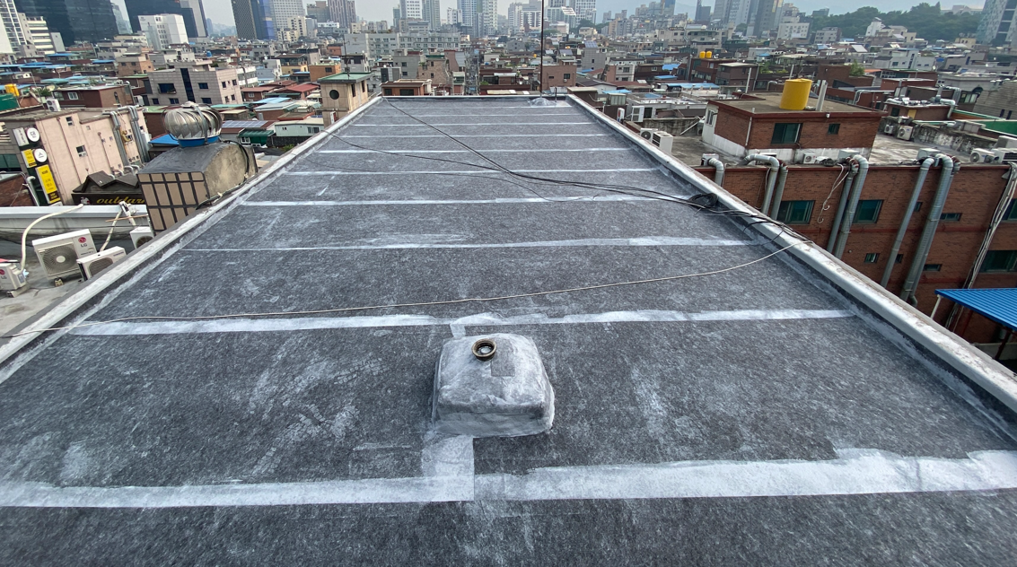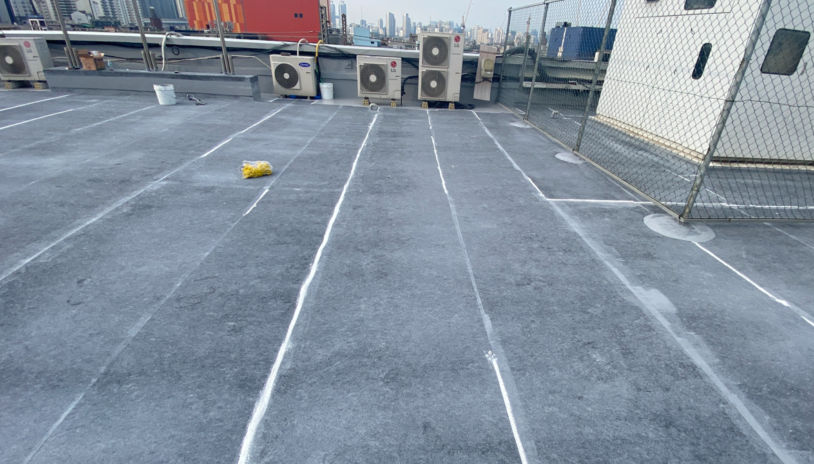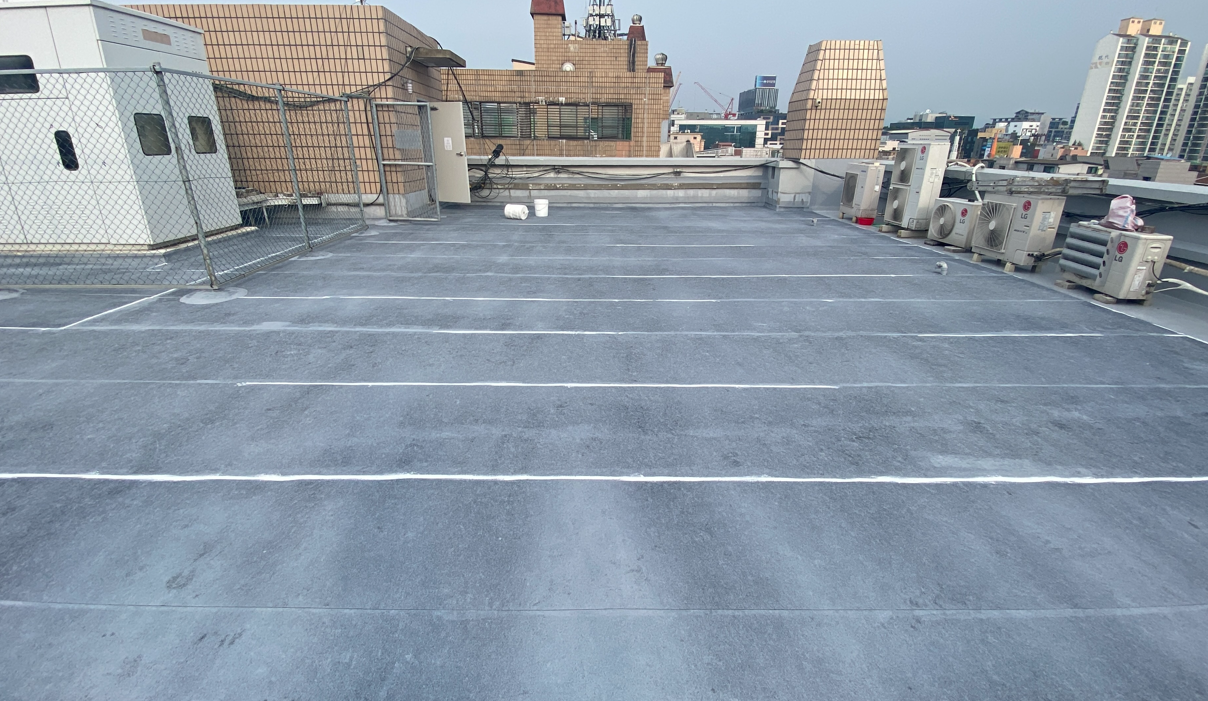 마지막 작업으로 상도를 진행합니다. 상도는 자외선을 차단하여 방수층을 보호하는 역할을 합니다. 이렇게 우레탄 도막방수 대신 진행한 복합시트 방수의 모든 과정이 마무리됩니다.