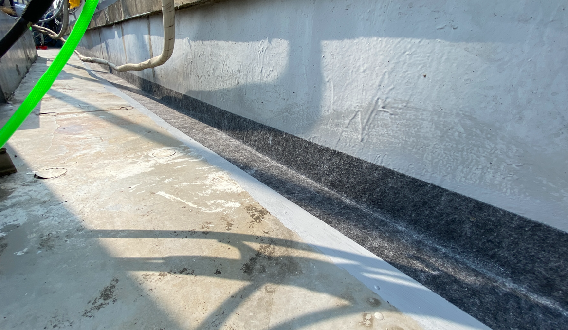 바닥에 부착한 시트가 떨어지면 그 틈으로 누수가 발생하기 때문에 함침 작업을 해서 서로 일체화시켜줍니다. 함침은 침투 방수액을 방수시트 전체에 도포하는 과정입니다.