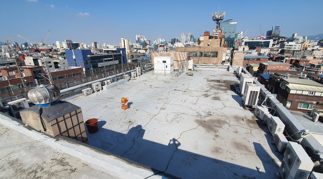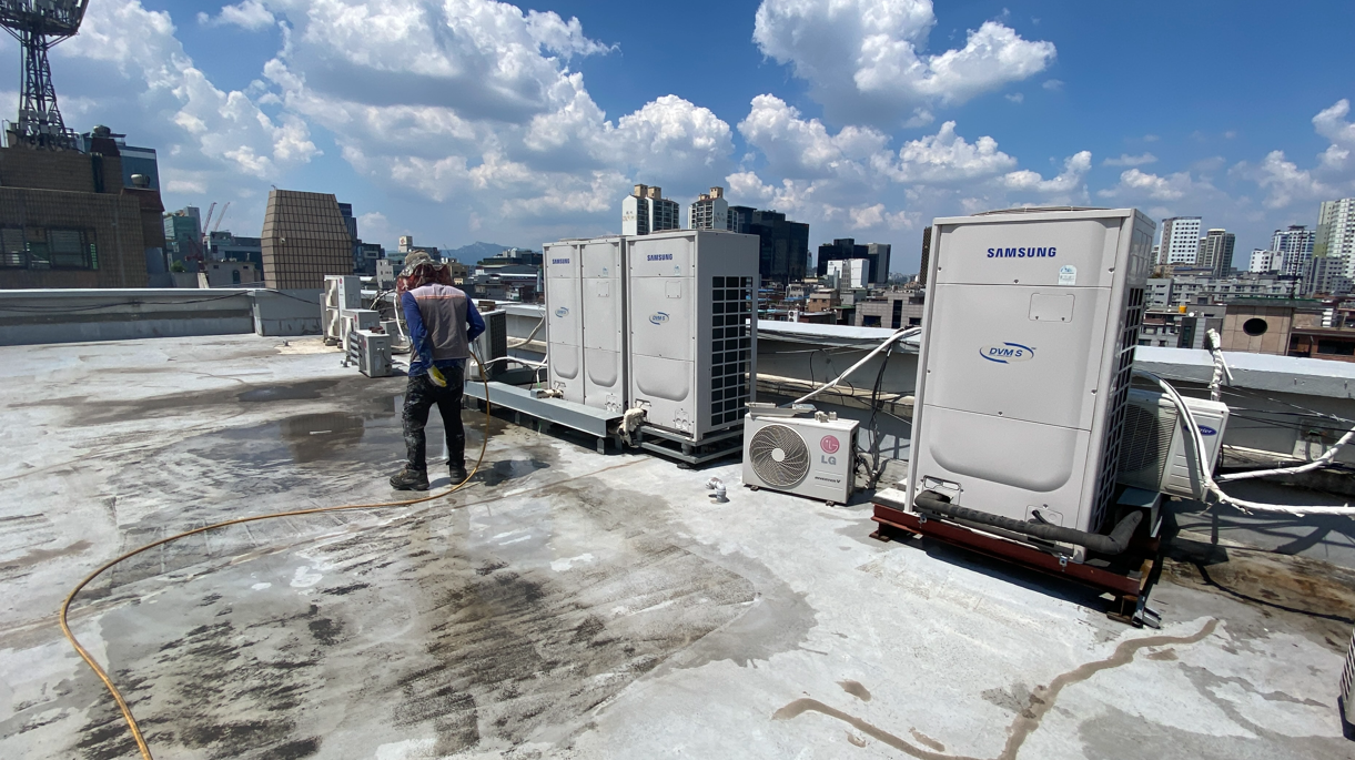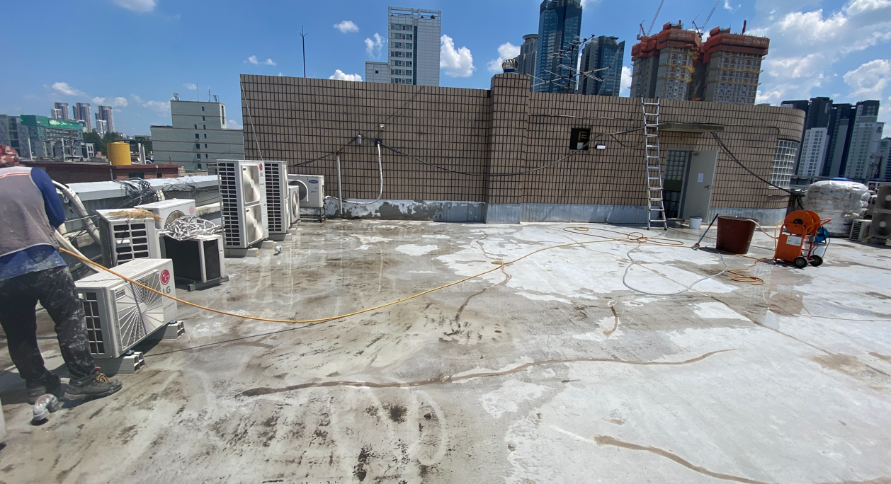 다음은 물청소를 진행합니다. 고압 세척기를 사용해 장시간 옥상에 쌓인 먼지와 각종 이물질 등을 깨끗하게 제거합니다.