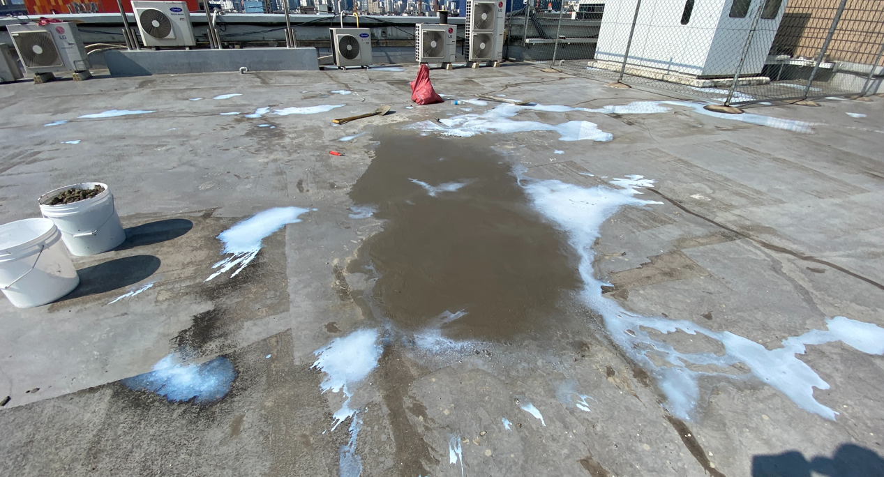 복합시트 방수 시공에 들어가기 전의 옥상 모습입니다. 한눈에 봐도 바닥이 많이 갈라져 있는데 우레탄 도막방수로는 이렇게 갈라진 크랙을 잡아줄 수가 없기 때문에 방수액과 함께 방수시트로 작업을 합니다.