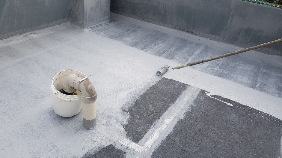 누수에 취약한 우수관이나 조인트 부분에는 방수액과 방수시트로 보강 작업을 먼저 진행합니다. 방수액을 도포한 후 시트를 부착하고 방수액을 다시 덧칠하여 작업합니다. 이 과정을 기초 시트 작업이라고 부릅니다.