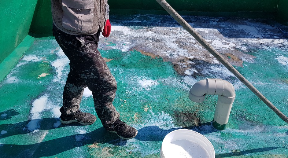 다음은 방수액 코팅 작업을 진행합니다. 작업에 사용하는 방수액은 돌가루를 원료로 만든 친환경 자재입니다. 천연 재료를 사용하여 인체에 닿아도 무해하고, 화학 자재 특유의 자극적이고 유해한 냄새가 없어서 시공 후에도 쾌적합니다. 방수액은 총 3번 코팅하여 7겹 이상의 방수층을 쌓아 방수력이 뛰어납니다.
