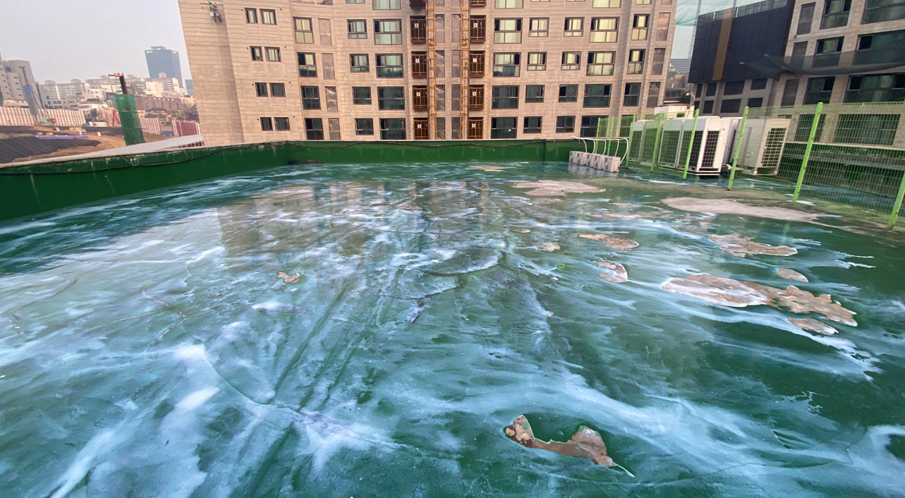우레탄으로 코팅한 옥상의 모습입니다. 하자가 발생한 부분에 임시로 덧칠을 하여 막았지만 얼마 지나지 않아 다시 터지고 말았습니다.