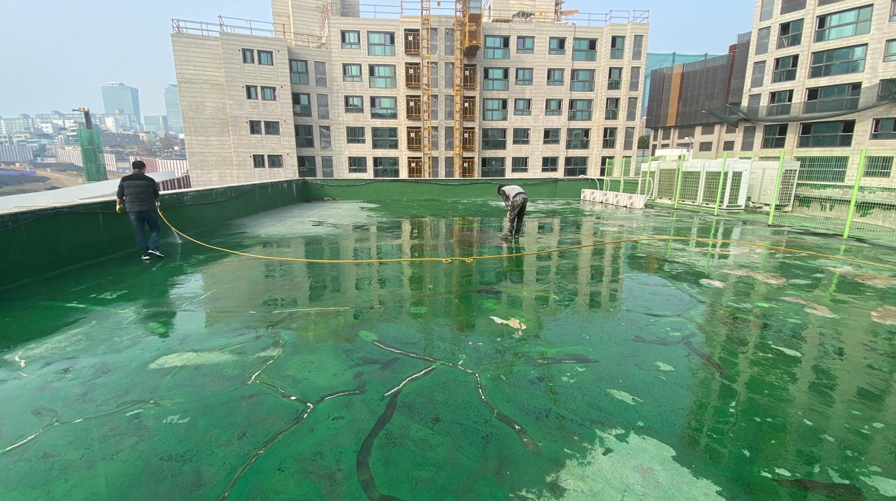 다음은 방수액 도포 작업입니다. 방수액은 총 3번 도포합니다. 앞선 시트 작업에 더해 7겹 이상의 방수층을 형성합니다. 작업에 사용하는 방수액은 돌가루를 원료로 만든 친환경 자재로 인체에 무해하고 화학 제품 특유의 자극적인 냄새가 없어 시공 후 쾌적합니다.
