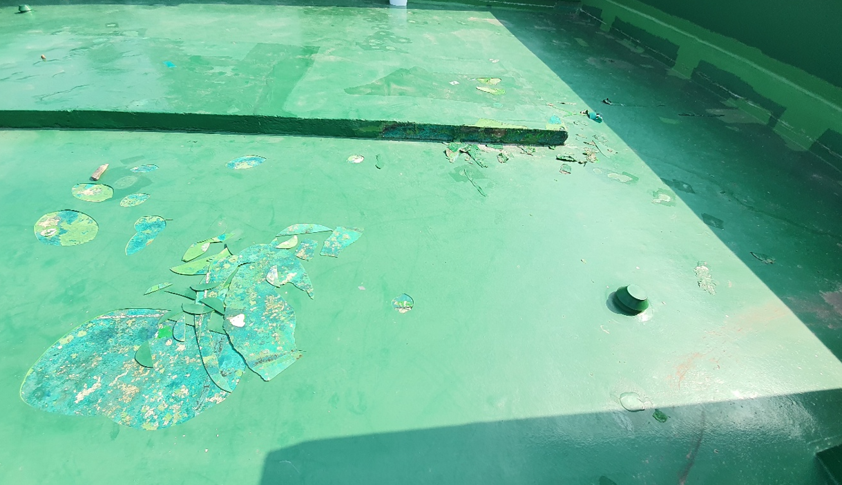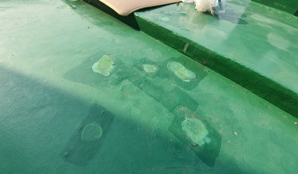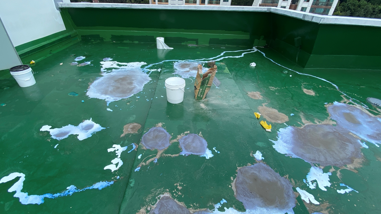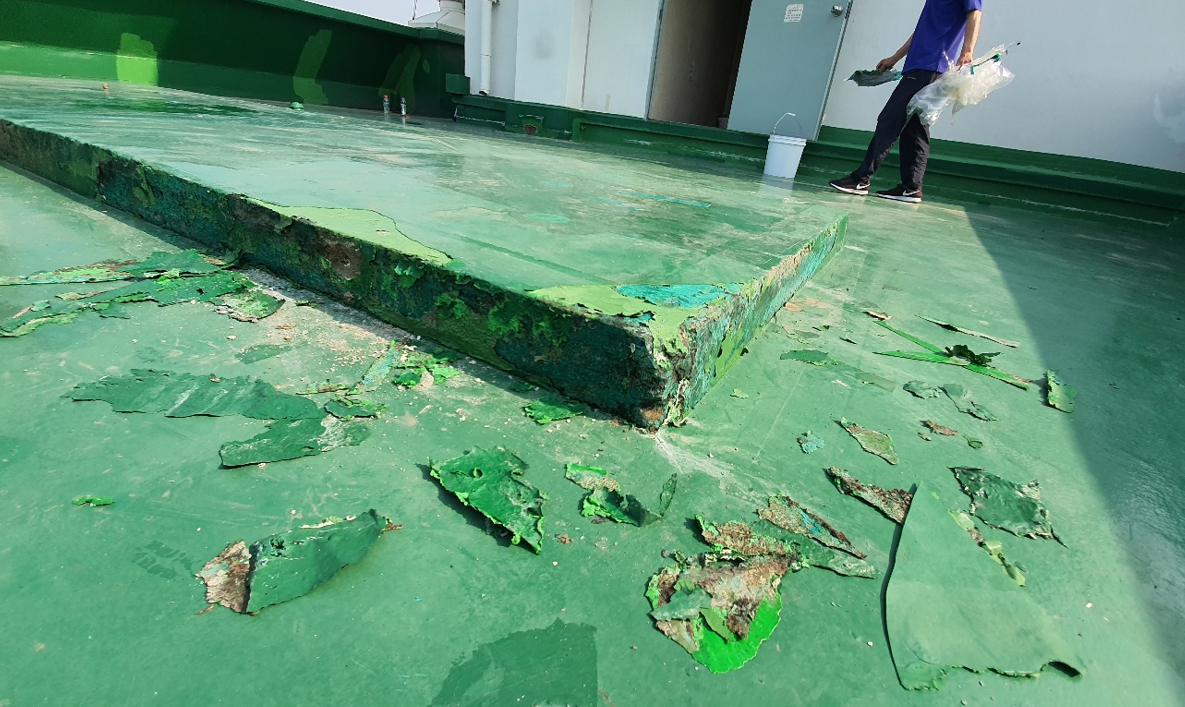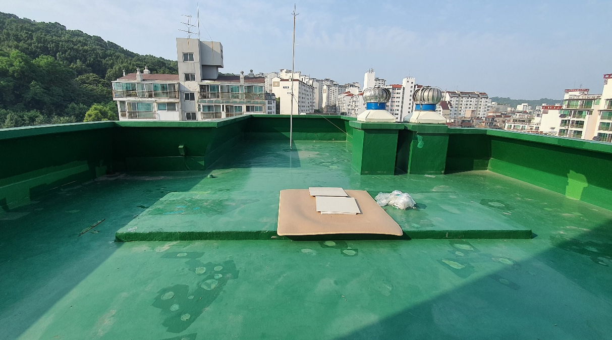 우레탄으로 방수를 한 옥상에 하자가 발생했기 때문에 복합시트 방수를 시공하기로 결정합니다. 옥상을 살펴보면 하자가 발생한 부분에 덧칠을 한 것을 볼 수 있습니다. 임시방편이기에 금방 터져 하자가 재발합니다.