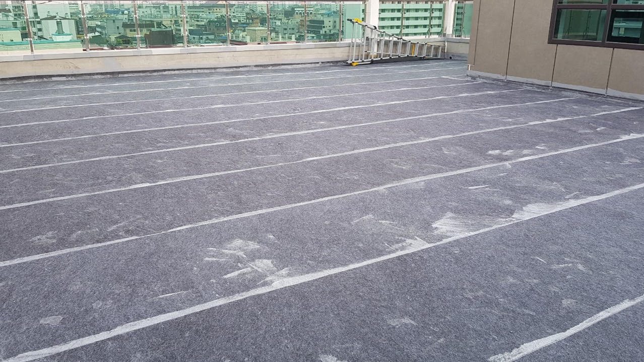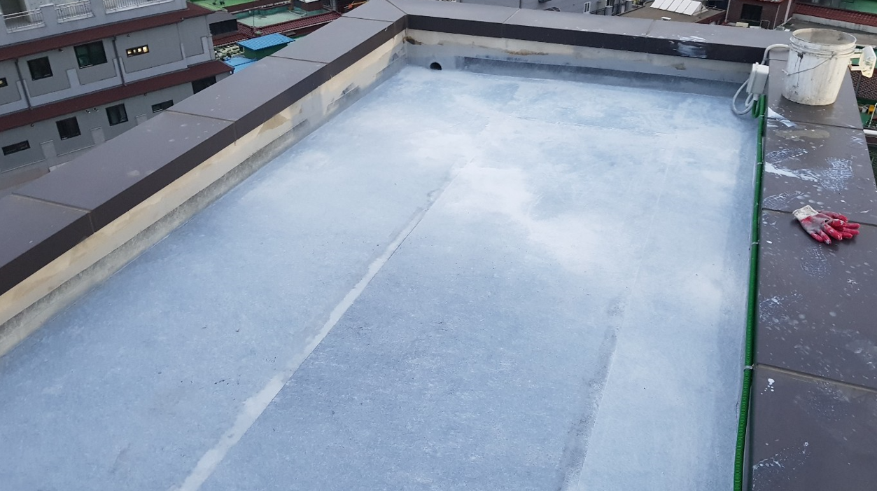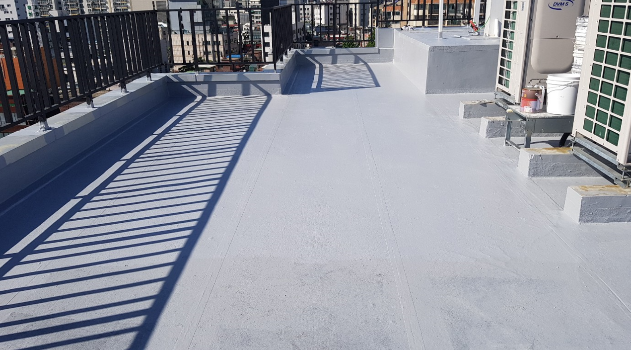 마지막으로 자외선을 차단하여 방수액을 보호하기 위해 상도를 진행합니다. 이렇게 옥상누수를 해결하기 위해 방수액과 방수시트로 크랙을 잡는 복합시트 방수의 모든 과정이 마무리됩니다.