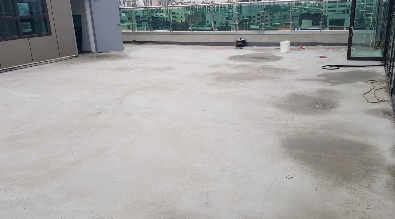 옥상에서 시작된 누수로 인해 천정까지 누수가 발생했습니다. 시공을 진행하기 전에 밑 작업으로 바닥을 정리하고, 물청소까지 간단하게 진행합니다. 물청소는 고압 세척기를 사용하여 작업합니다.