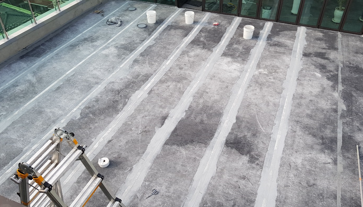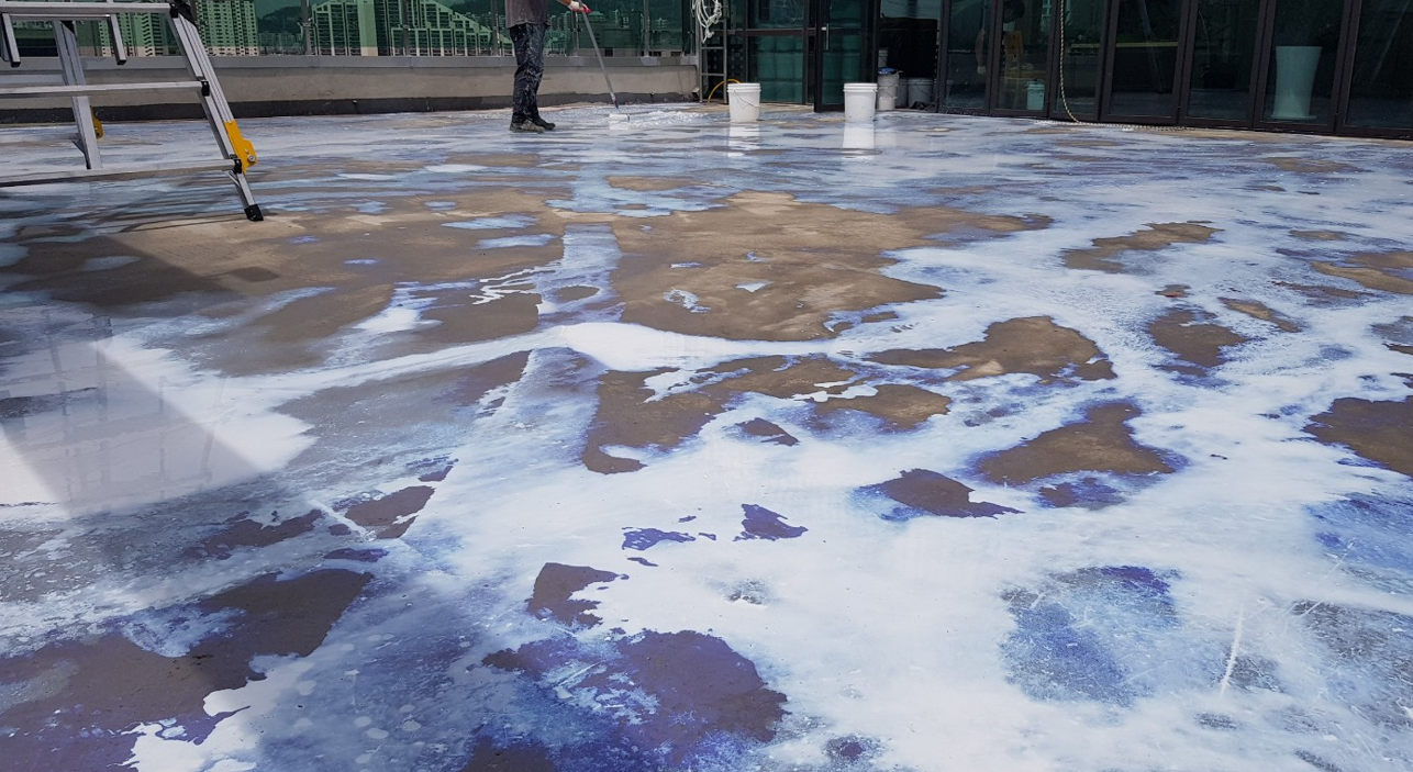 옥상 바닥의 먼지와 이물질을 제거하기 위해 프라이머 작업을 진행합니다. 프라이머는 침투 방수액을 바닥 전체에 도포하는 작업으로, 옥상에 침투 방수 효과를 주는 역할을 하는 과정입니다.