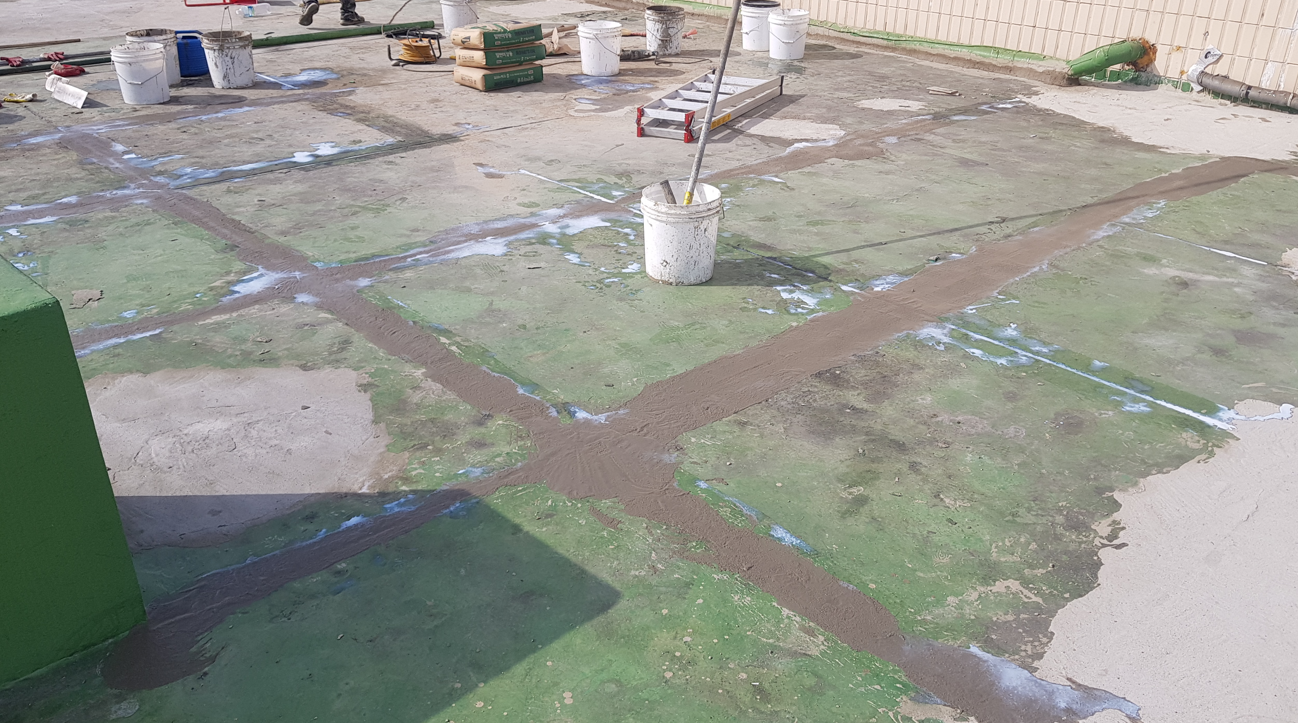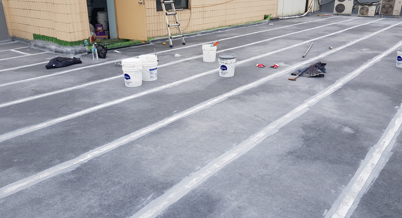 시트 작업에 들어가기 전에 옥상 바닥에 침투 방수액을 전체적으로 도포합니다. 이 과정이 프라이머 작업으로 바닥에 침투 방수의 효과를 주고 미세한 먼지들을 흡착하여 제거하는 역할을 합니다.