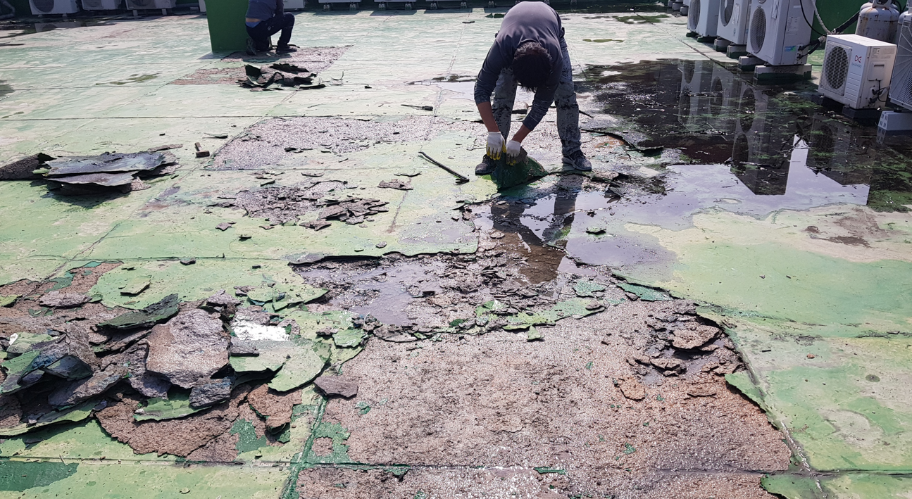 우레탄으로 작업한 옥상입니다. 시간이 지남에 따라 바닥이 견디지 못하고 하자가 발생했습니다. 그래서 이번에는 방수액과 방수시트를 함께 사용해서 방수 공사를 진행할 예정입니다.