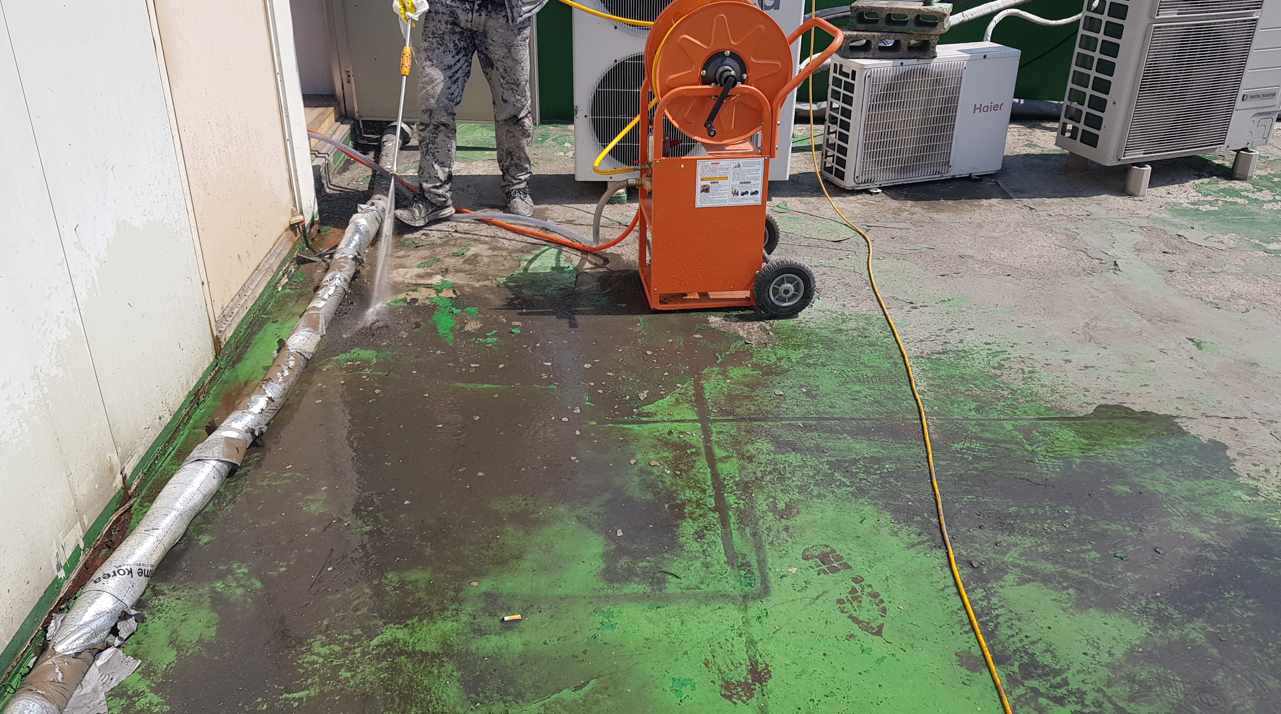 바닥을 정리한 후 물청소 작업에 들어갑니다. 장시간 쌓인 먼지와 이물질을 제거하기 위해 고압 세척기로 물청소를 합니다.