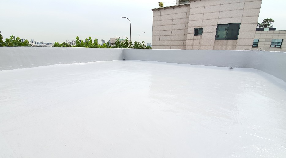 마지막 작업으로 상도를 진행합니다. 상도는 자외선을 차단하여 방수층을 보호하기 위한 작업입니다. 이렇게 친환경 소재로 만든 방수 페인트를 방수시트와 함께 사용하면 보다 튼튼한 옥상을 만들 수 있습니다. 시공 후 관리가 잘 된다면 계속해서 고쳐서 사용할 수 있는 옥상이 만들어집니다.