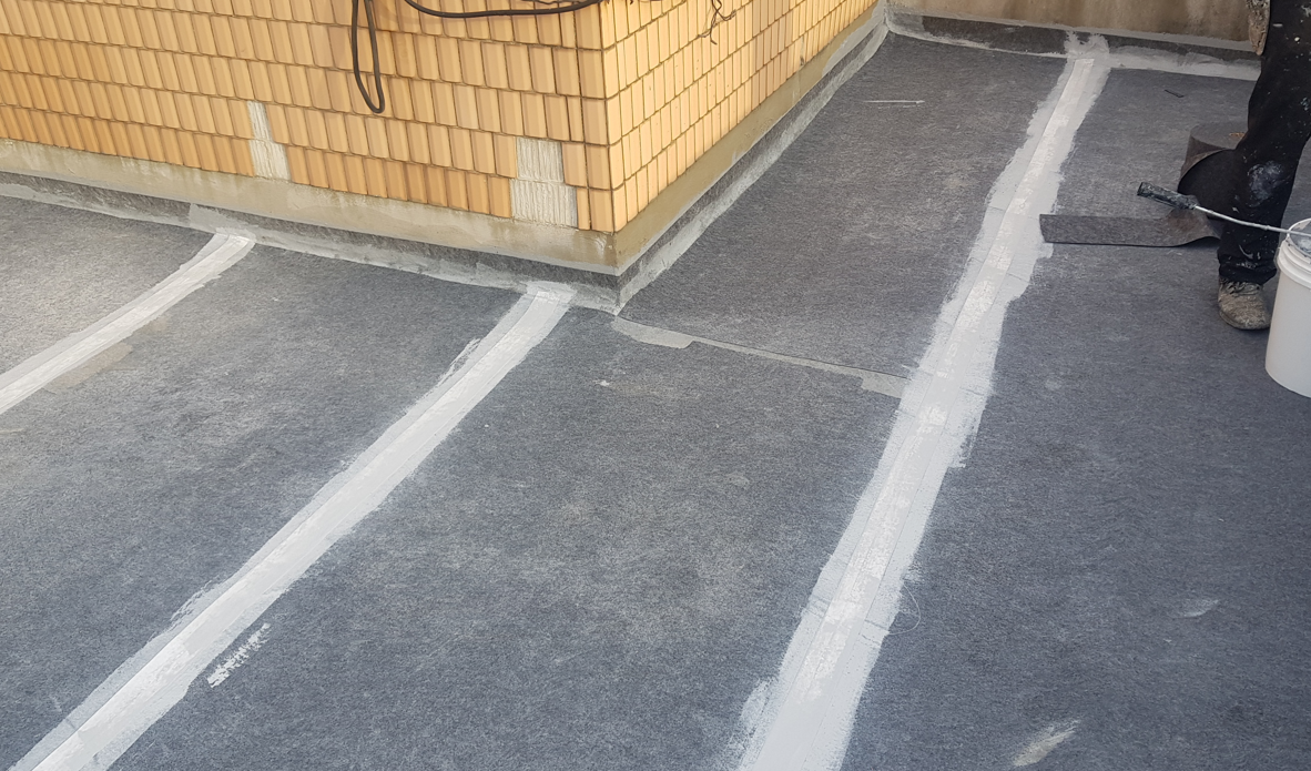 다음은 함침 작업입니다. 함침은 침투 방수액을 시트 전체에 도포하는 작업입니다. 방수시트와 바닥을 서로 일체화시켜 떨어지지 않게 만들어줍니다. 누수가 발생하지 않도록 시트와 바닥 사이의 공간을 없애는 작업입니다.