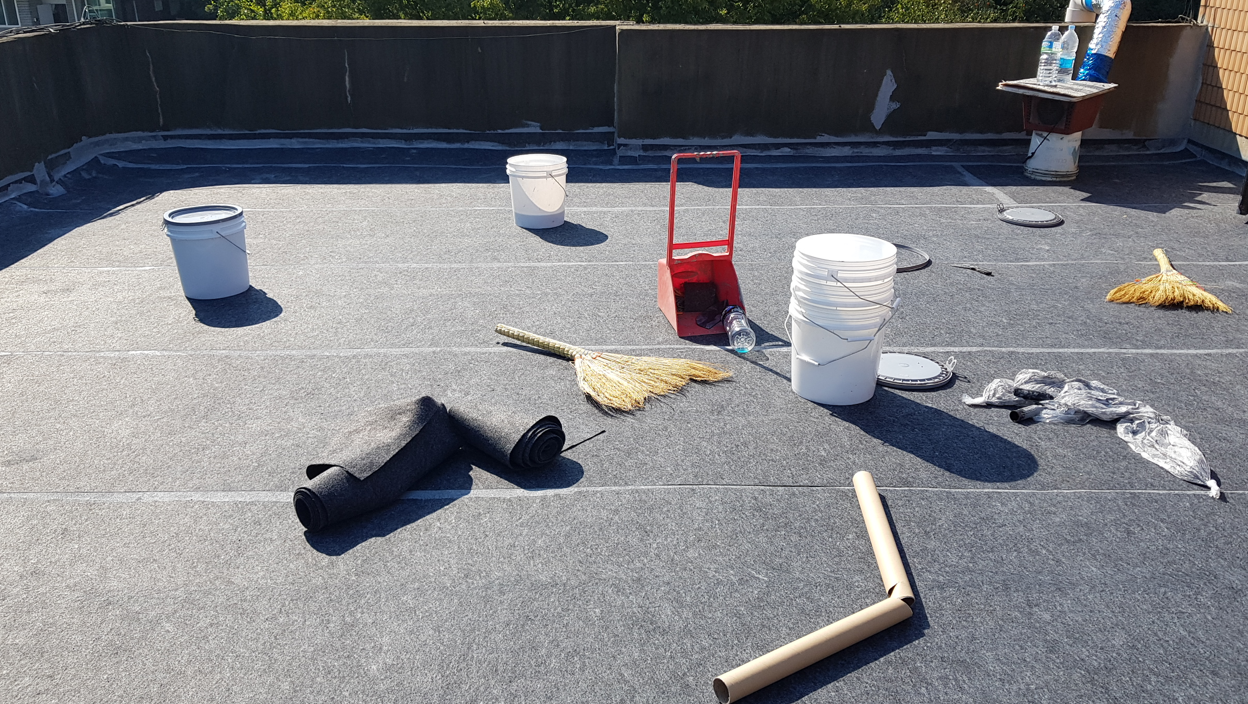 이번엔 바닥 전체에 방수시트를 부착합니다. 방수 페인트를 먼저 도포한 후 시트를 부착하면 접착제 역할을 하여 잘 붙습니다. 시트는 옥상의 크랙이 다시 갈라지지 않게 잡아주는 역할을 합니다. 하자의 재발률을 낮추기 위한 과정입니다.