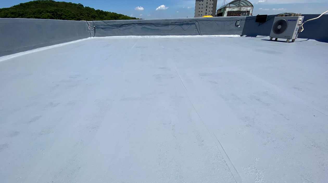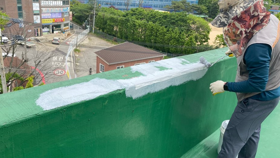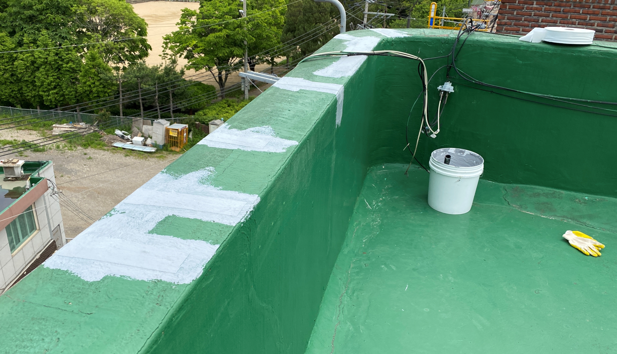마무리 작업으로 상도를 진행합니다. 상도는 자외선을 차단하여 방수층을 보호하는 역할을 합니다. 이렇게 방수액과 방수시트를 함께 사용하는 방수 방법으로 시공을 하면 보다 튼튼한 옥상을 만들 수 있습니다.