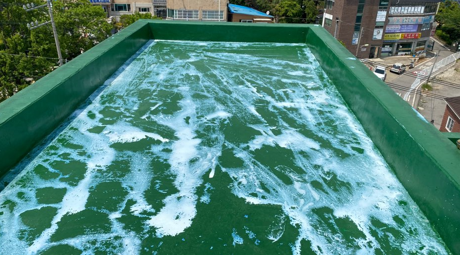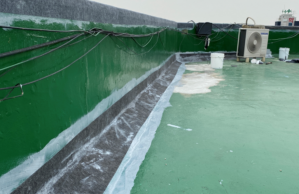 시트 작업을 모두 마무리한 후 방수액 도포를 시작합니다. 작업에 사용하는 방수액은 돌가루를 원료로 만들어 인체에 무해합니다. 자극적인 기름 냄새가 없어 시공 후에도 두통이나 메스꺼움 등의 유발 없이 쾌적합니다. 방수액 도포 작업은 3차례 작업하여 방수층을 두텁게 쌓아줍니다.