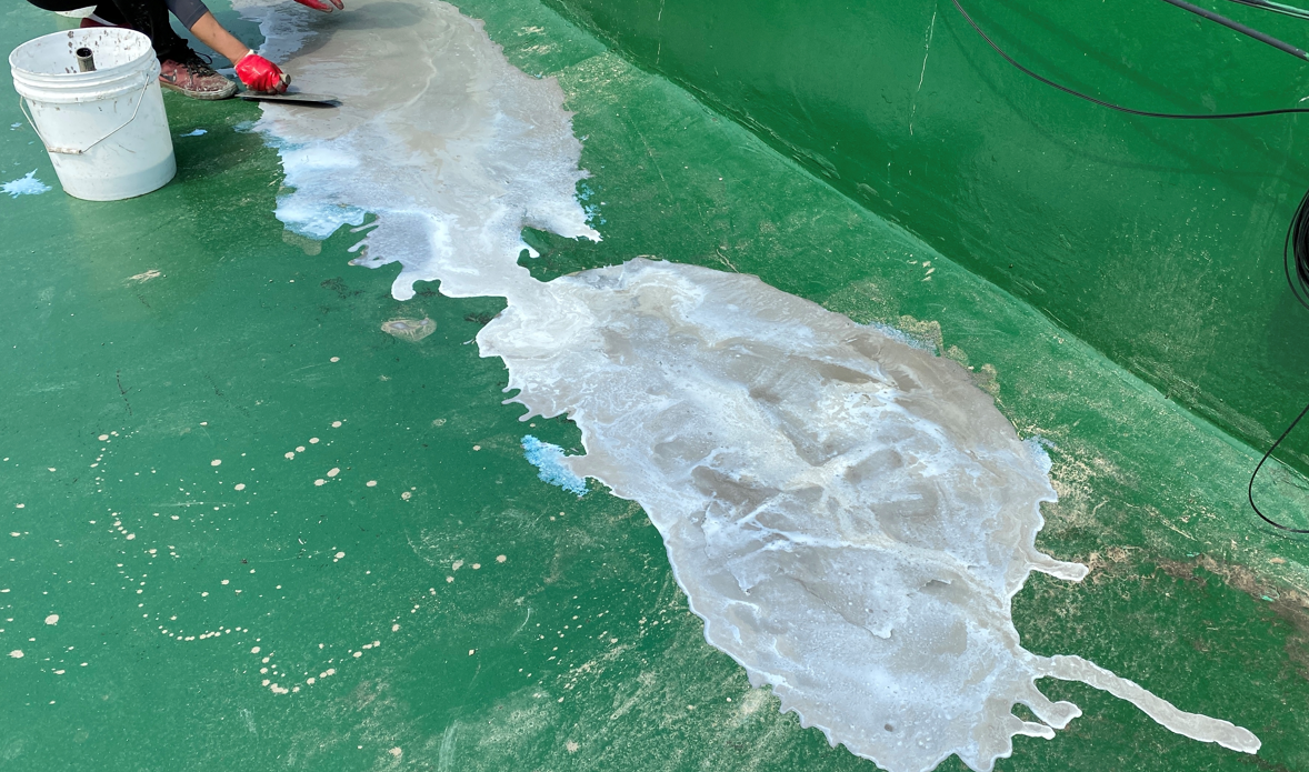 방수시트를 바닥에 모두 부착했다면 이제 침투 방수액을 시트 위에 전체적으로 도포합니다. 이 작업은 함침 작업으로 옥상 바닥과 방수시트를 떨어지지 않게 일체화시키는 과정입니다.