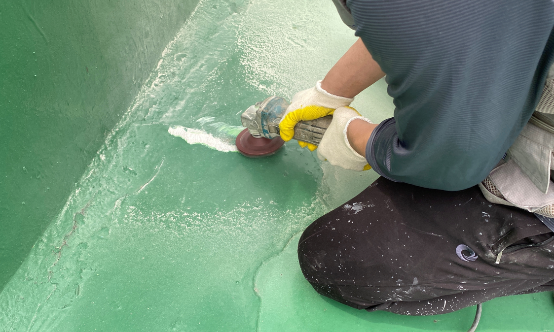 그래서 이 두 가지 방수 방법의 장점을 합친 복합시트 방수로 시공을 진행할 예정입니다. 먼저 밑 작업으로 바닥을 정리합니다. 하자가 일어난 부분은 가능한 데까지 들어내 제거하고, 도구가 필요한 부분은 칼과 그라인더 등을 사용합니다.