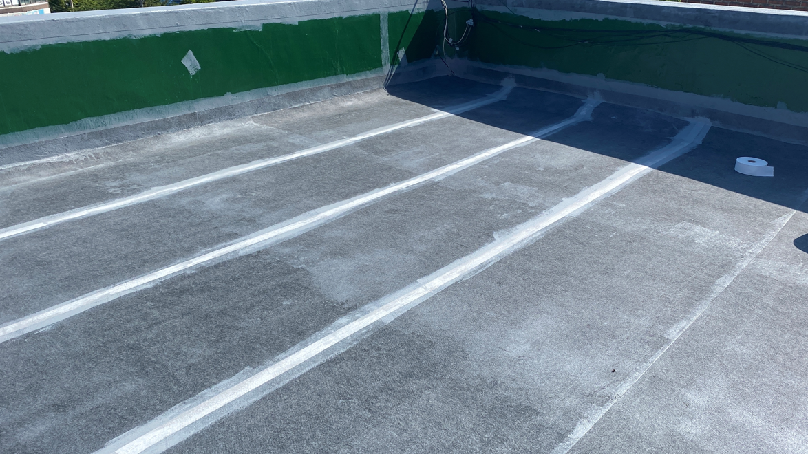 다음은 보강 시트 작업입니다. 방수시트를 부착할 때 서로 조금씩 겹쳐서 작업하는데 그 틈으로 누수가 발생하지 않도록 막기 위한 작업입니다. 밴드 형태의 방수시트를 부착하여 작업합니다.
