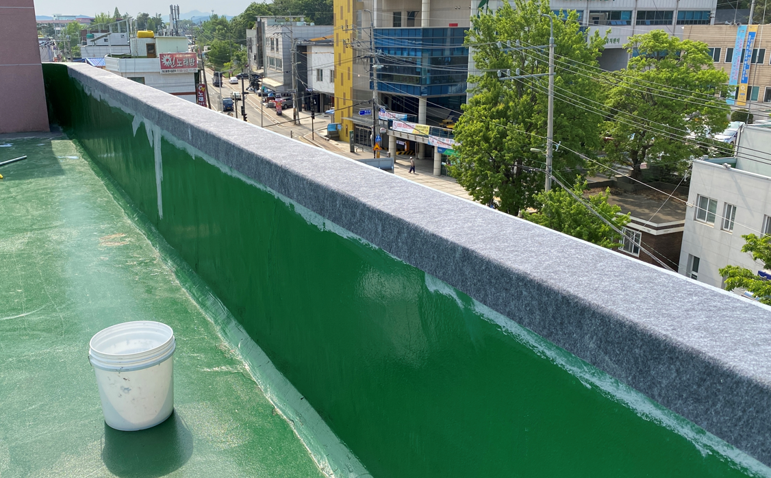 바닥에 시트를 부착하기 전에 난간을 먼저 작업합니다. 앞서 벽체에 작업한 것보다 조금 더 튼튼한 시트로 난간에 작업을 진행합니다. 방수액을 도포한 후 방수시트를 부착합니다.