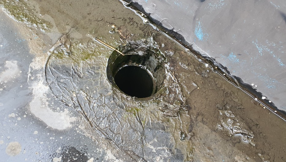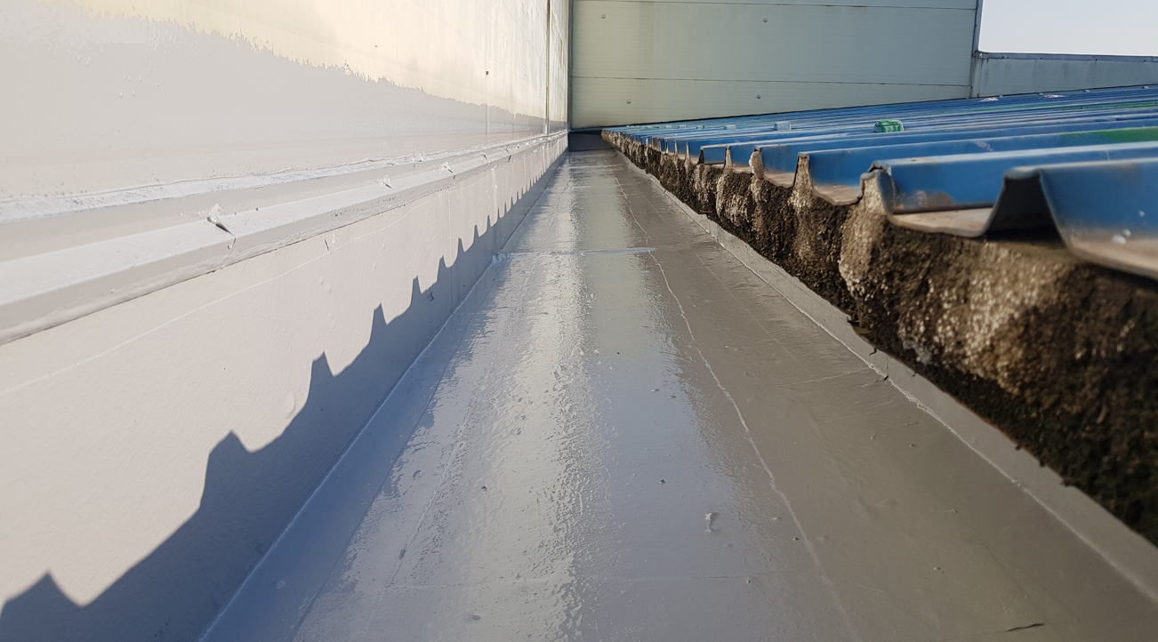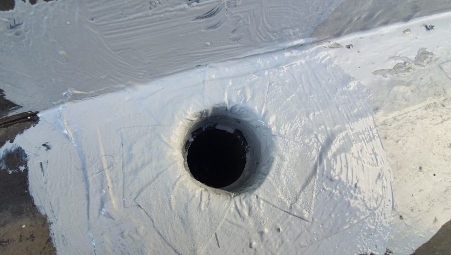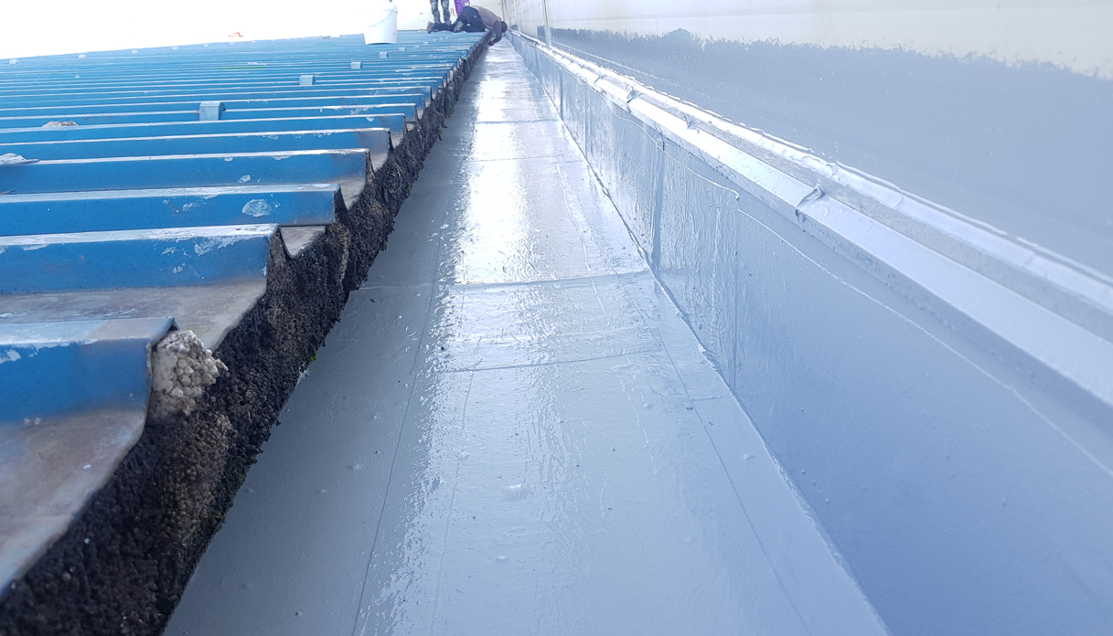 이제 물이 밑으로 빠져나가는 우수관과 배수로의 이음새 부분에 기초적인 시트 작업을 시작합니다. 터져버린 실리콘 등은 깔끔하게 제거하고 방수액을 먼저 도포한 후 시트를 부착하고 다시 덧칠합니다. 그런 다음 방수시트를 배수로에 전체적으로 부착합니다.