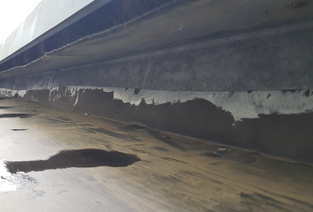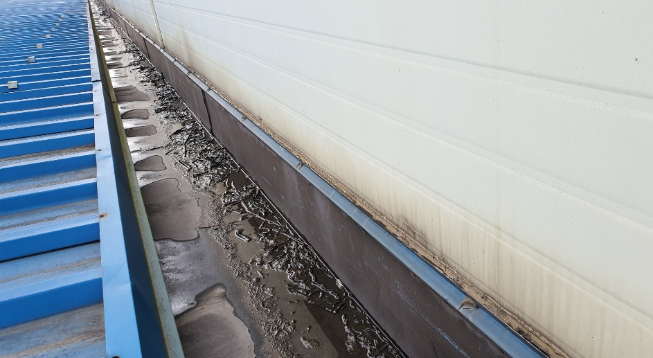 보시다시피 배수로에 고여있는 물과 함께 이물질이 많습니다. 철로 된 부분에 녹이 슬어 하자가 쉽게 발생하는데 보통 실리콘 등으로 급하게 보수를 합니다. 하지만 지붕이 태양열을 직접적으로 받는 부분이라 열에 약한 실리콘은 다시 쉽게 터져버립니다.