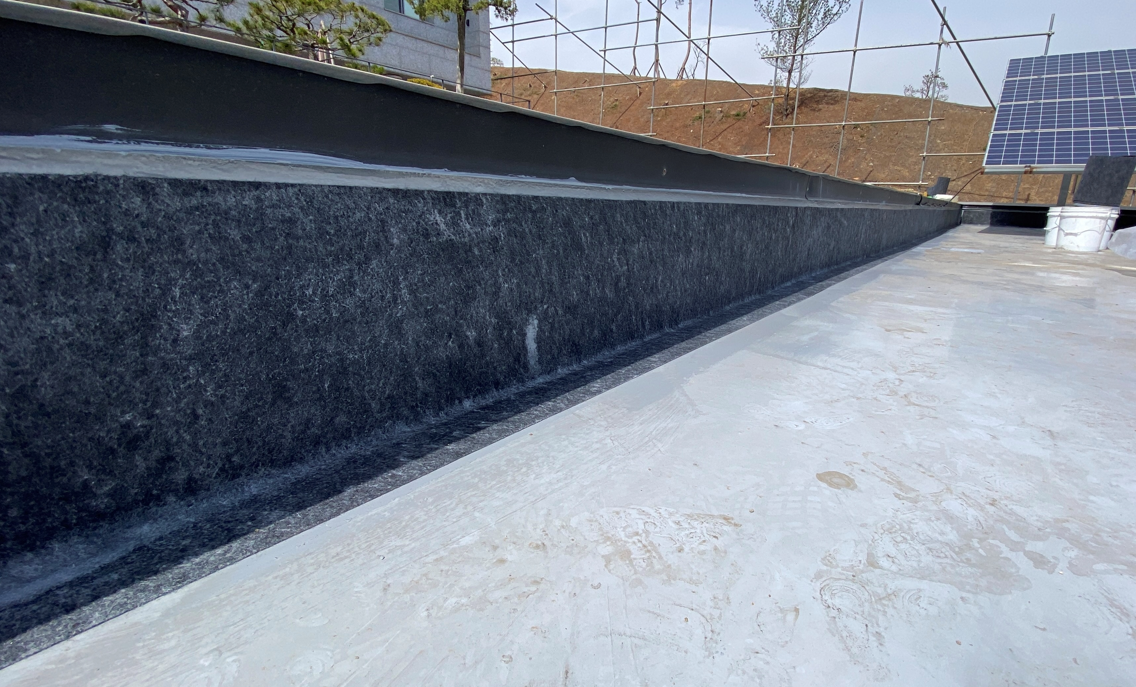 프라이머 작업을 진행한 후 기초 시트 작업에 들어갑니다. 누수에 취약한 부분을 보강하기 위한 기초 작업입니다. 빗물이 모여 흘러내려가는 우수관이나 조인트 부분이 이에 해당합니다. 방수액을 도포한 후 시트를 부착하여 작업합니다.