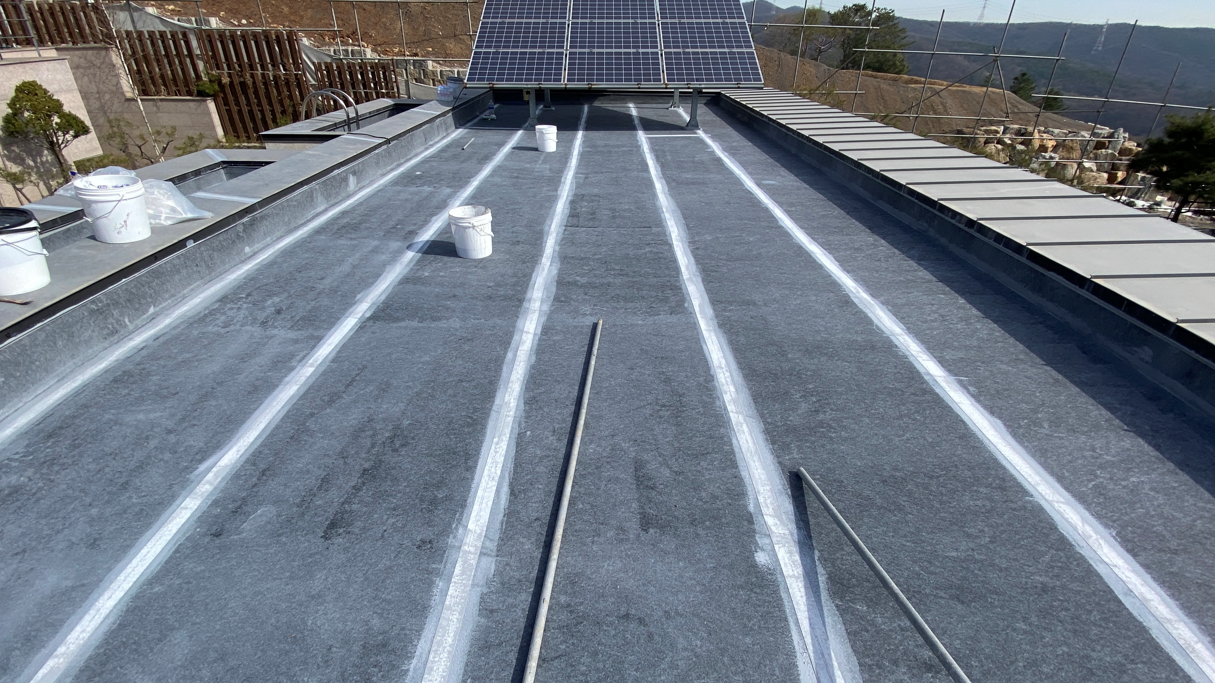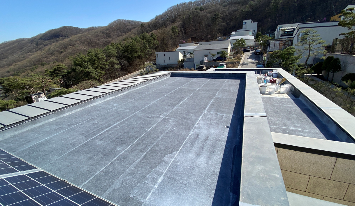 마지막 작업으로 상도를 진행합니다. 상도는 자외선을 차단하여 방수층을 보호하는 역할을 합니다. 이렇게 방수액과 방수시트로 작업한 방수 시공의 모든 과정이 마무리됩니다. 시공 후 관리가 잘 된다면 계속해서 고쳐서 쓸 수 있는 옥상을 만들 수 있습니다.