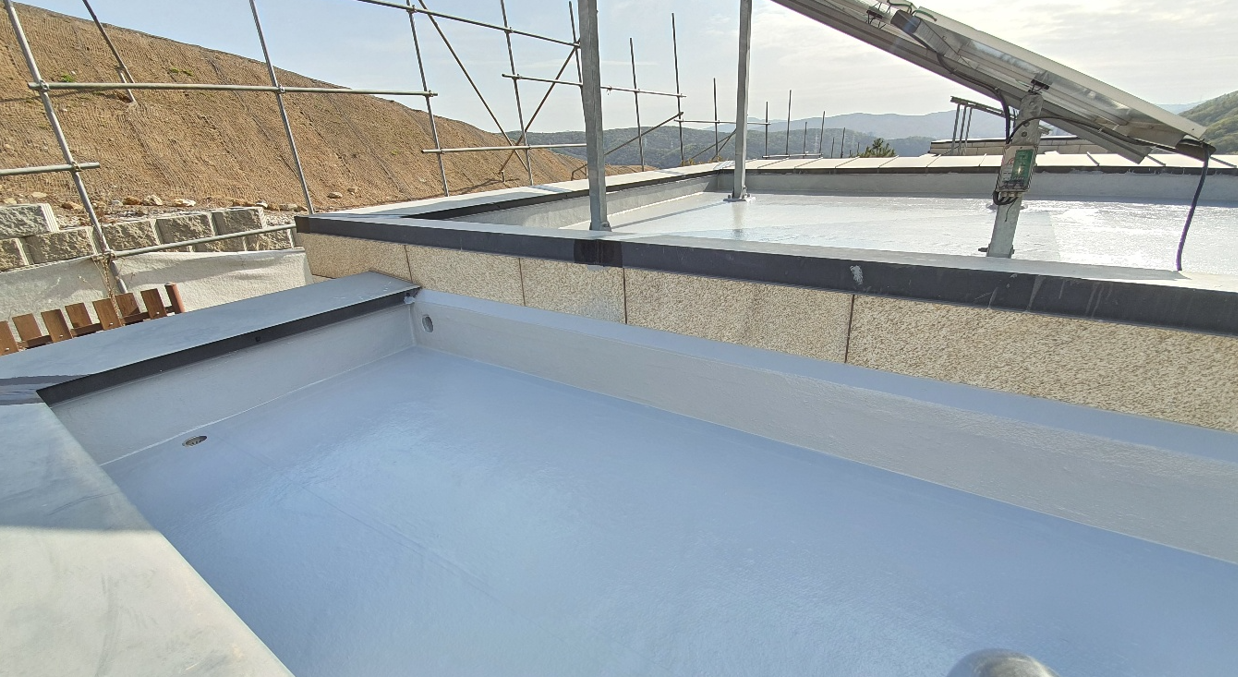 완성된 방수시트층 위에 방수액을 도포할 차례입니다. 시트로 크랙을 확실하게 잡아준 후 방수액으로 층을 쌓아주면 확실하게 방수 시공을 할 수 있습니다. 작업에 사용하는 방수액은 돌가루를 원료로 만든 친환경 방수액입니다. 작업은 총 3차례에 걸쳐 진행하여 모두 합해 7겹 이상의 방수층을 형성합니다.