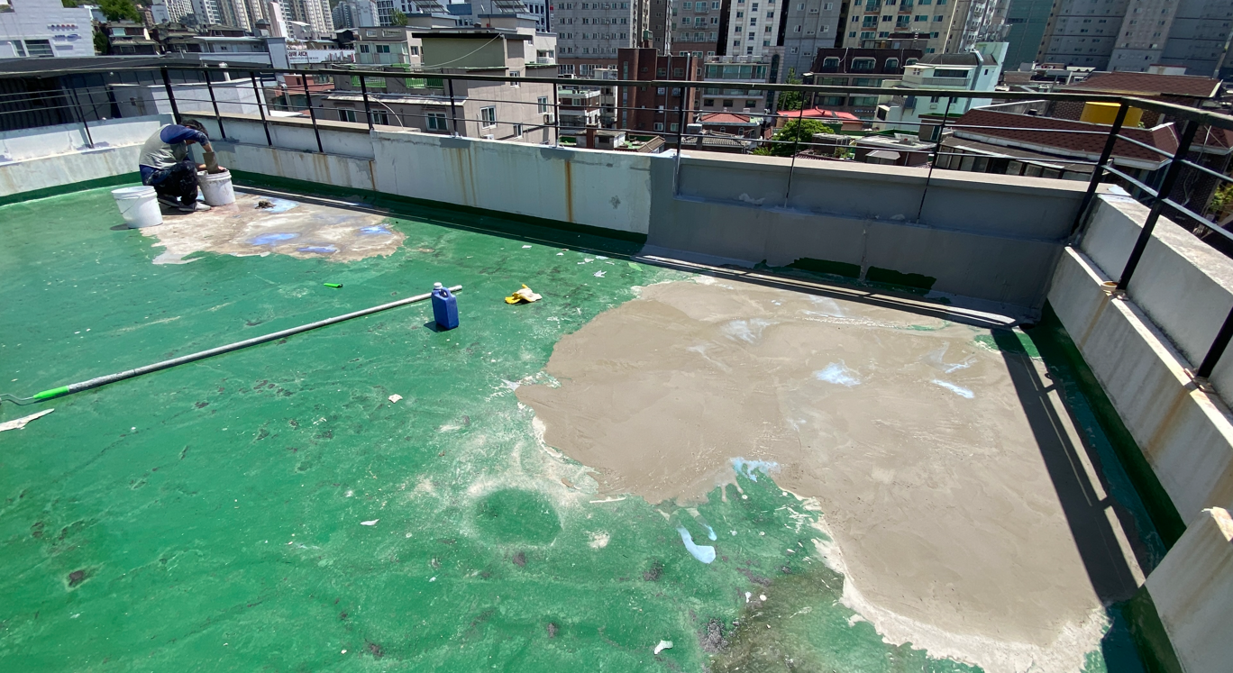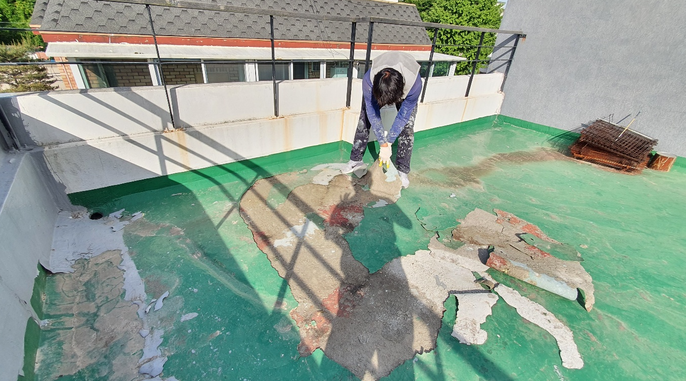 이제 옥상에 방수액과 시트를 함께 사용하여 복합시트 방수를 시공하려고 합니다. 본격적인 작업에 앞서 기초 작업으로 바닥 정리에 들어갑니다. 원활한 시공을 위해 하자가 생긴 바닥 부분을 최대한 제거하는 작업입니다. 바닥을 정리한 후 물청소까지 진행합니다.
