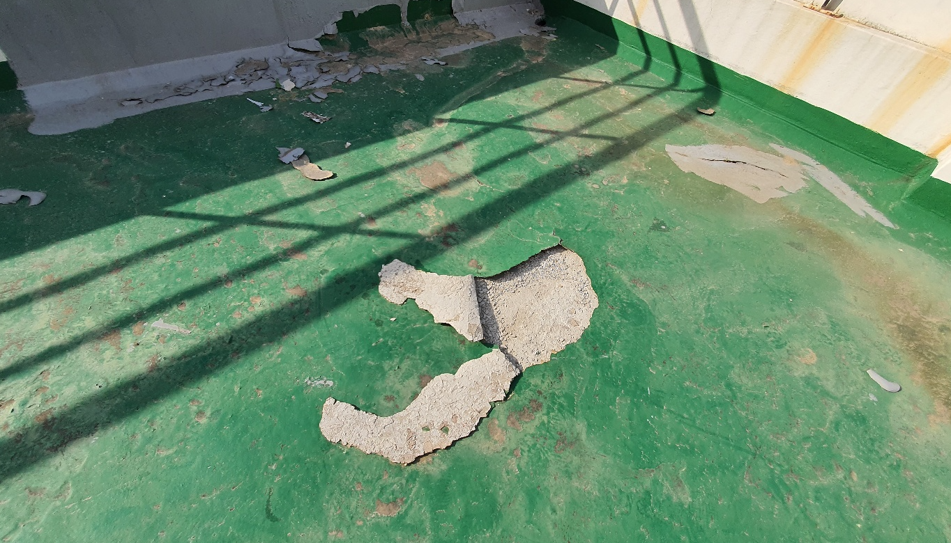 우레탄으로 작업한 옥상의 모습입니다. 보이는 대로 바닥에 하자가 발생했습니다. 우레탄은 작업이 비교적 쉽고 비용이 저렴한 반면 하자가 생기기 쉽습니다.