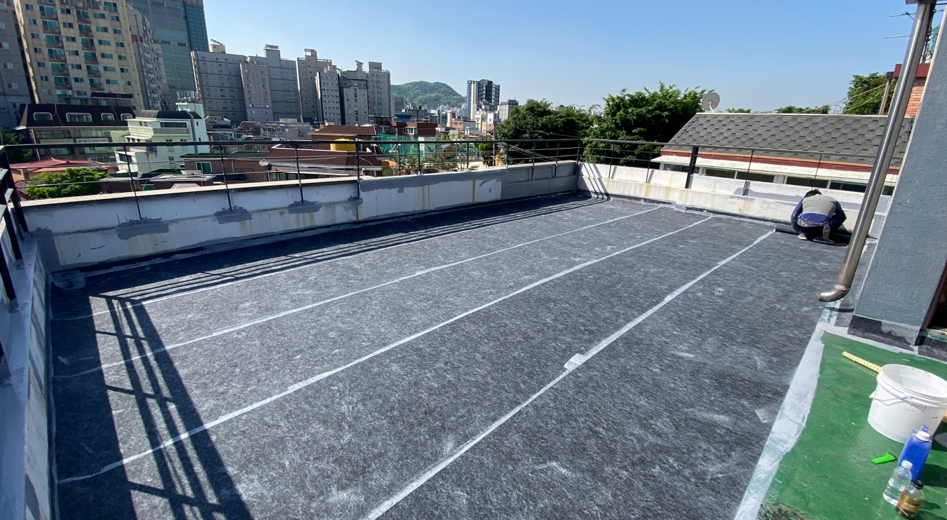 기초 작업 후 바닥 전체에 방수시트를 부착합니다. 작업에 사용하는 시트는 질긴 섬유 소재로 만들어져 옥상의 크랙을 단단하게 고정하는 역할을 합니다. 방수액을 접착제 역할로 도포한 후 시트를 부착하여 방수액을 머금도록 만들어줍니다.