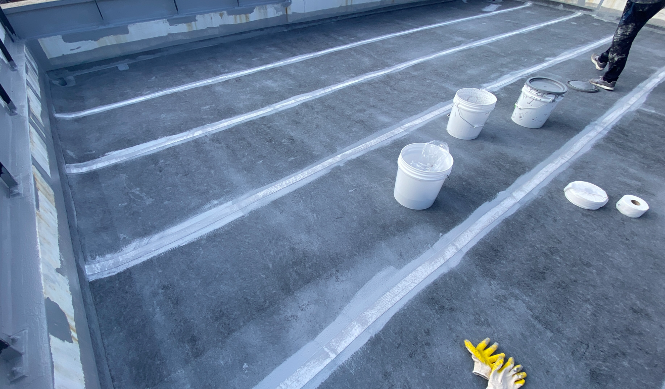 방수시트와 바닥 사이에 공간이 생기면 그 틈으로 누수가 발생합니다. 바닥에서 시트가 들떠 틈이 생기기 않도록 함침 작업을 진행합니다. 함침은 침투 방수액을 시트 위에 전체적으로 도포하는 작업입니다.