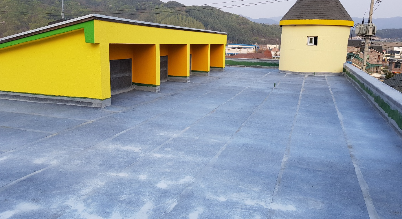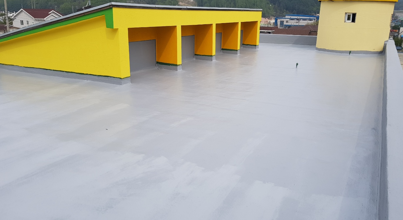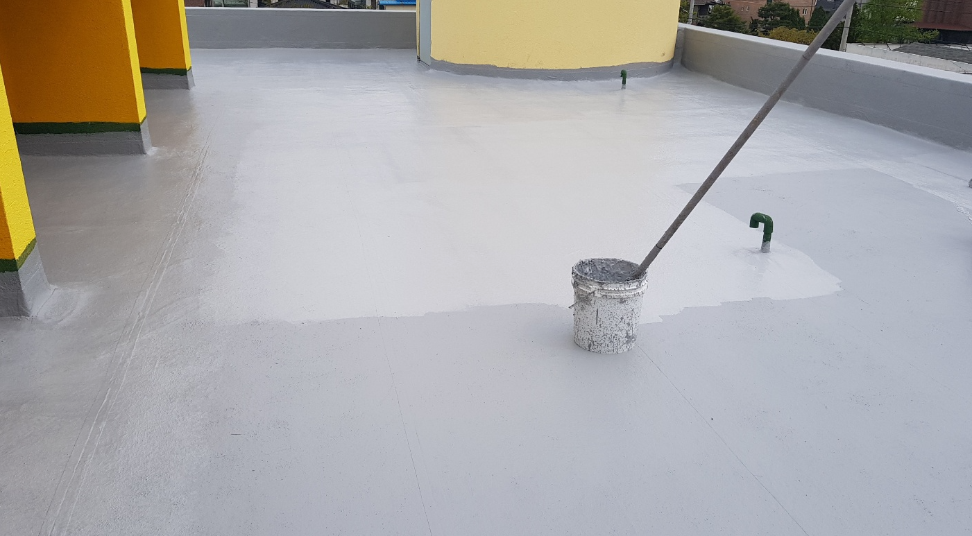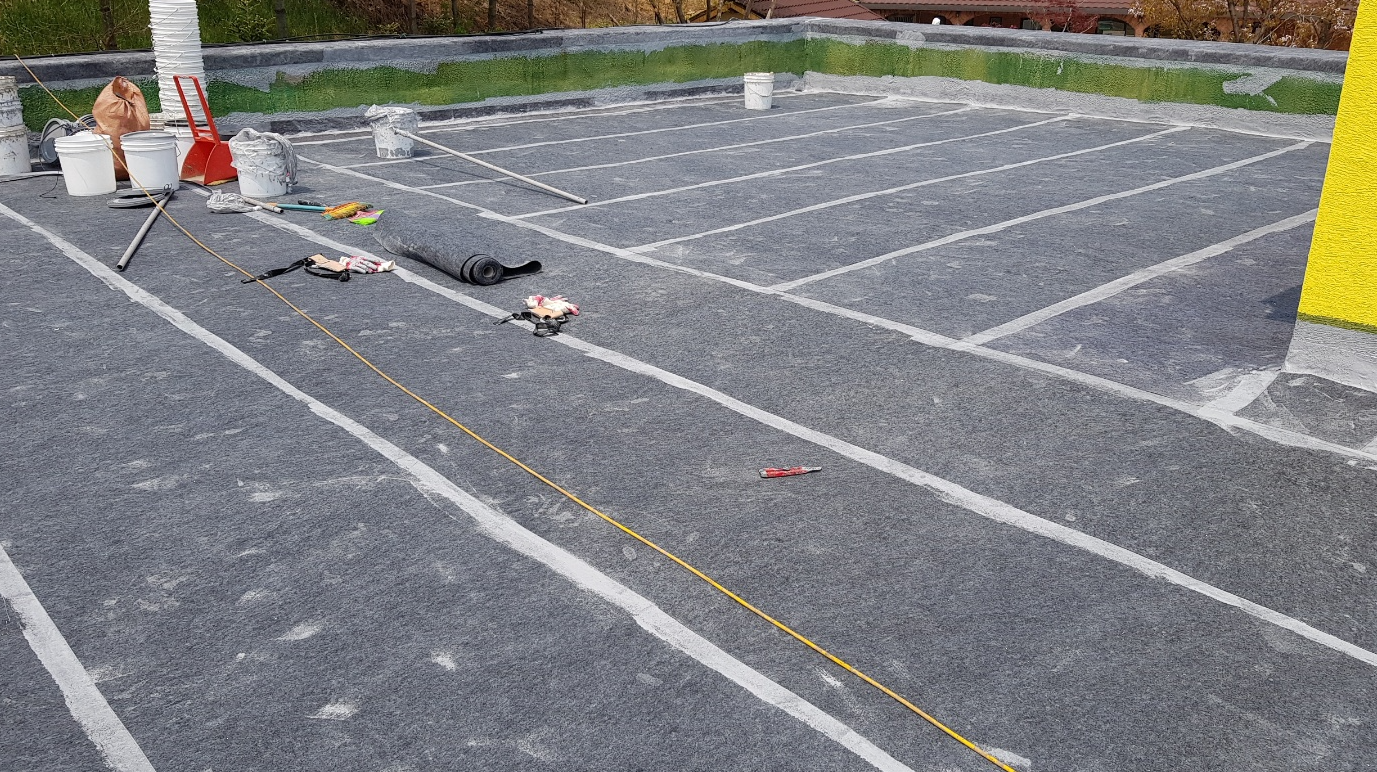 이제 모든 시트 작업이 끝났으니 방수액을 도포할 차례입니다. 방수액은 3번 도포하여 방수층을 튼튼하게 쌓아줍니다. 작업에 사용하는 방수액은 돌가루를 원료로 만들었기 때문에 인체에 무해하고 천연 재료를 사용하여 자극적인 냄새가 없어 시공 후 쾌적합니다. 우레탄과 같은 화핵 재료의 경우 기름 냄새로 인해 두통과 메스꺼움 등을 유발할 수가 있습니다.