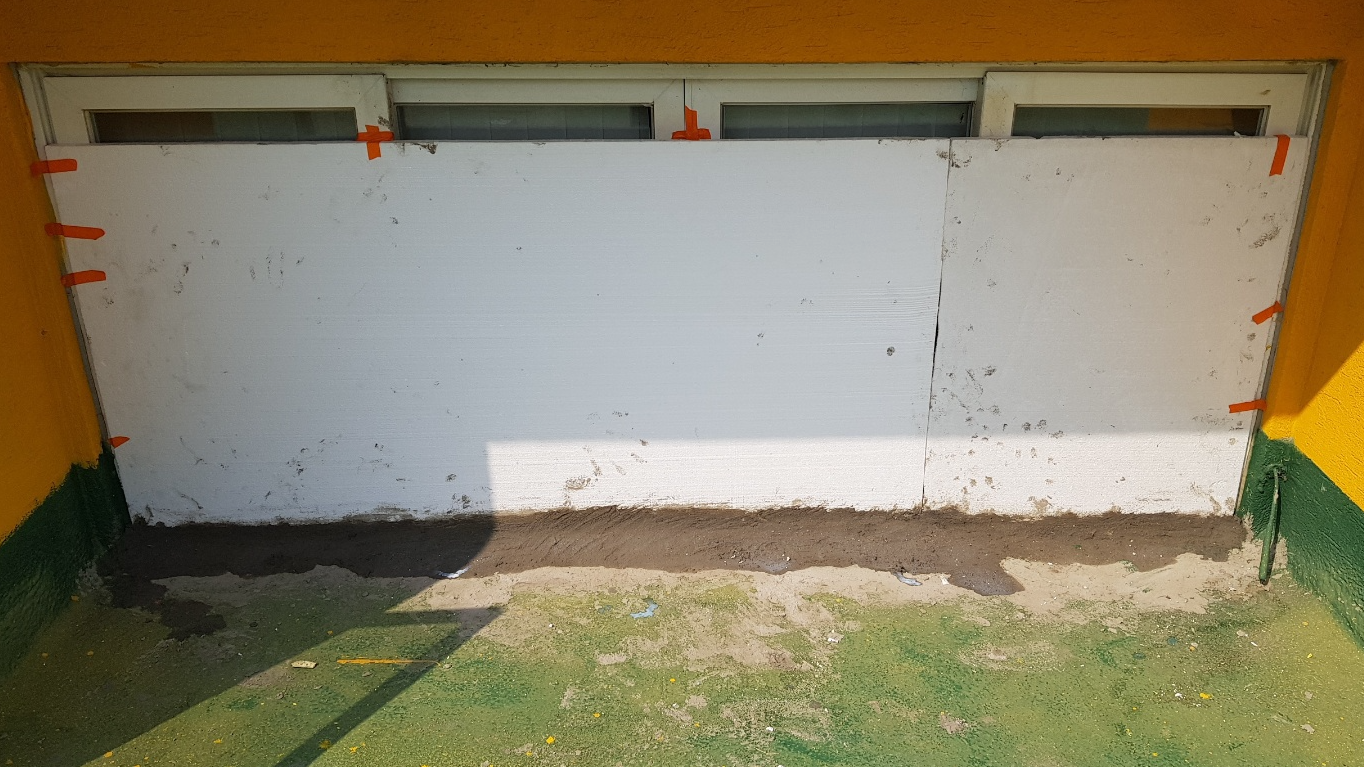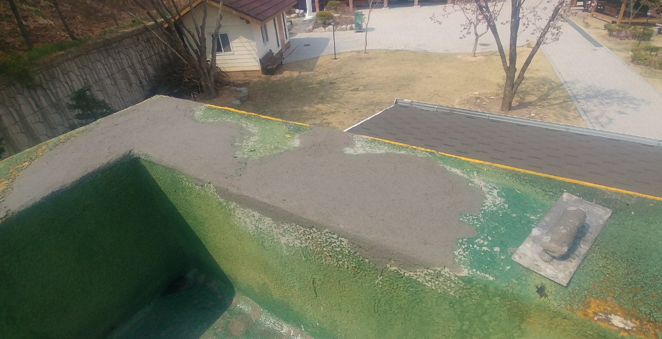 먼저 외벽의 크랙과 건물 내부로 이어지는 창문을 막기 위해 미장 작업을 진행합니다. 미장은 단차가 있는 바닥에도 해주는 것이 좋습니다. 몰탈과 침투 방수액을 적절한 비율로 혼합하여 작업을 진행합니다.