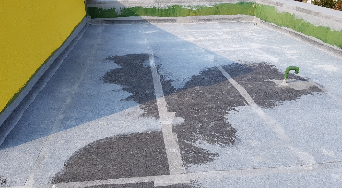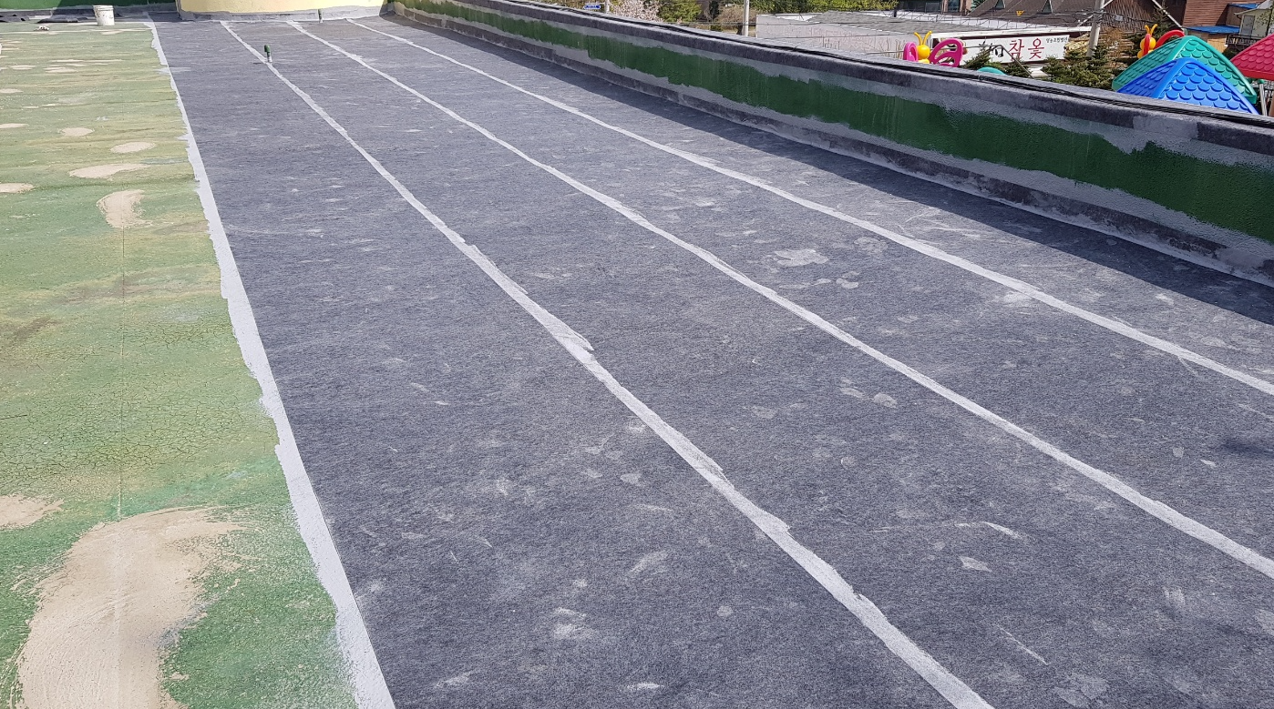 누수에 취약한 우수관이나 조인트 부분, 또는 구조물이 있는 곳에는 기초 시트 작업을 진행합니다. 방수액을 먼저 칠한 후 시트를 시공 부위에 알맞게 잘라 붙여 작업합니다. 방수 시트는 섬유 재질이라 시공 부위에 따라 적절하게 붙일 수 있습니다.