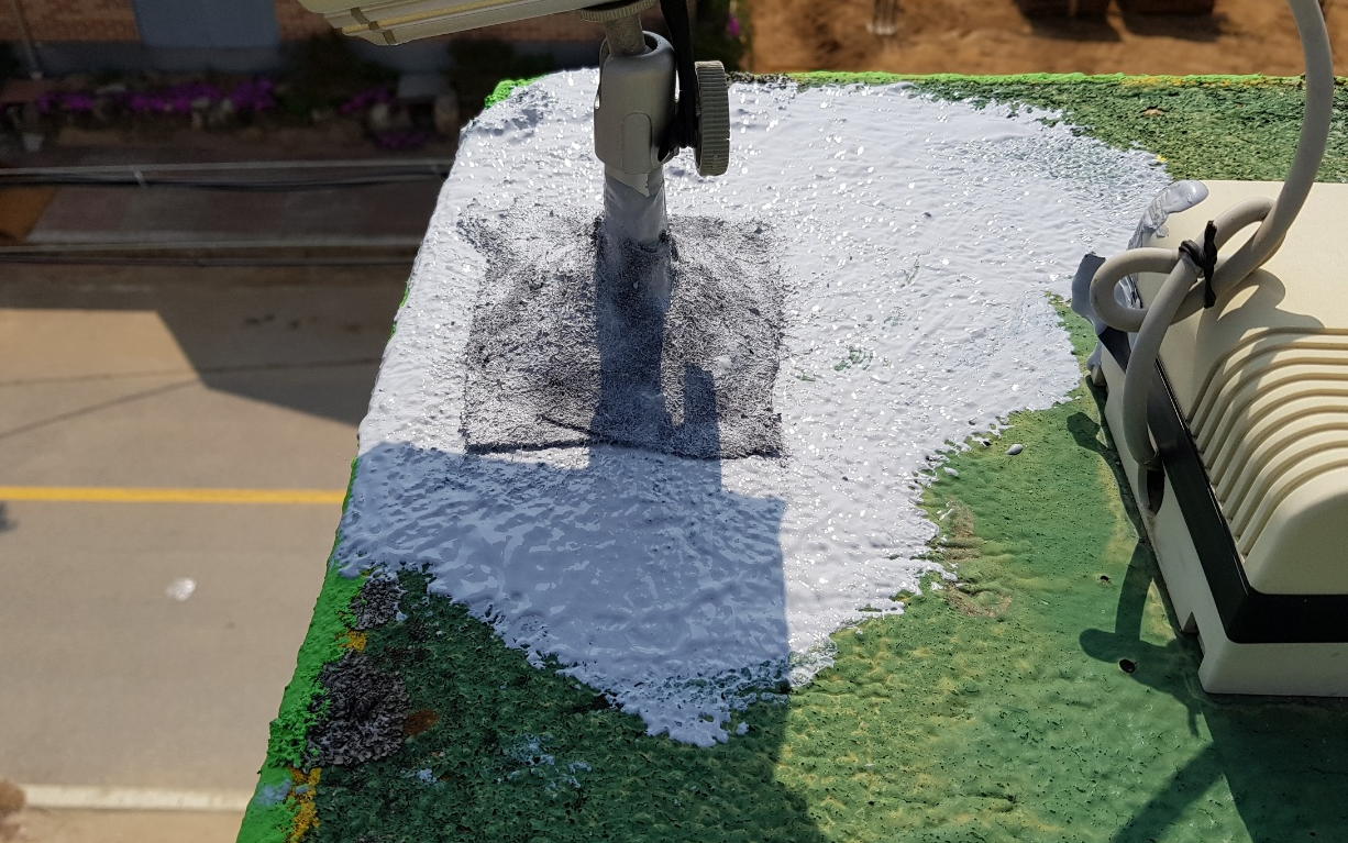 시트를 모두 붙였다면 함침 작업을 진행합니다. 함침은 침투 방수액을 시트 위에 전체적으로 도포하는 작업입니다. 이렇게 하면 옥상 바닥과 방수 시트를 서로 일체화시켜 떨어지지 않아 누수가 발생할 틈이 사라집니다.