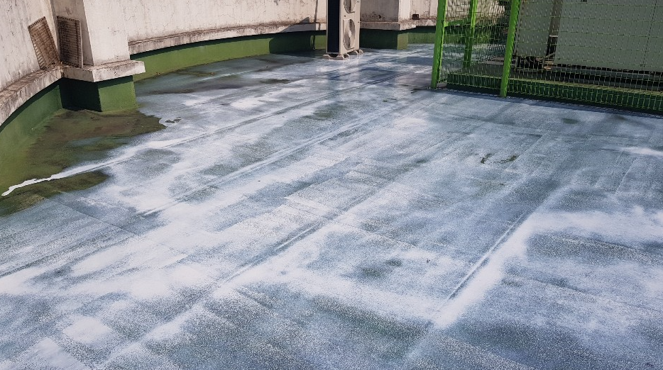 하자가 생긴 바닥 부분을 제거한 후 물청소 작업을 진행합니다. 물청소는 고압 세척기를 사용하여 작업합니다. 옥상에 장기간 쌓인 먼지와 각종 이물질을 제거하여 원활한 시공 환경을 만들기 위한 작업입니다.