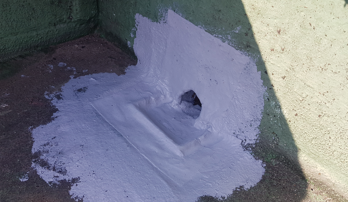 크랙이 생긴 벽체나 누수가 발생하기 쉬운 우수관, 조인트 부분에는 기초 시트 작업을 진행합니다. 방수액과 시트로 하는 보강 작업으로 방수액을 먼저 도포한 후 시트를 부위에 알맞게 잘라 붙입니다.