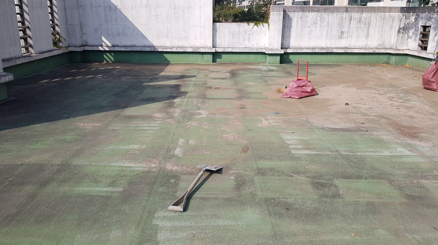이에 따른 해결책으로 복합 시트 방수가 있습니다. 크랙을 잡지 못하는 기존 우레탄을 대신하여 방수 시트가 그 역할을 대신하고 그 위에 방수액을 도포하여 방수층을 쌓는 방법입니다. 시공에 들어가기에 앞서 하자로 인해 못쓰게된 바닥을 제거하기 위해 간단한 정리 과정을 진행합니다.