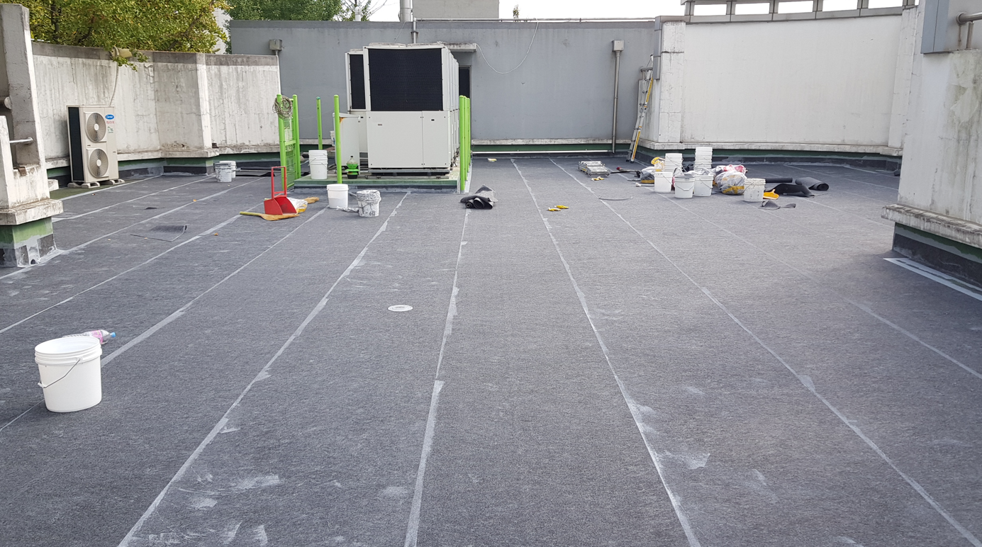 기초 작업이 끝난 후에는 바닥 전체에 방수 시트를 부착합니다. 작업에 사용하는 시트는 질긴 섬유 소재로 만들어 크랙이 다시 갈라지지 않도록 잡아 주고 눈에 보이지 않는 건물의 수축과 팽창에 견뎌 옥상의 수명을 연장시키는 효과가 있습니다. 방수액을 먼저 도포한 후 시트를 조금씩 겹쳐서 부착합니다.