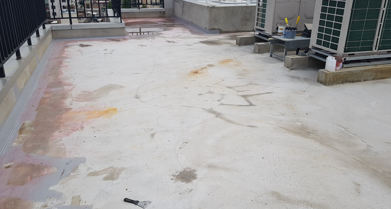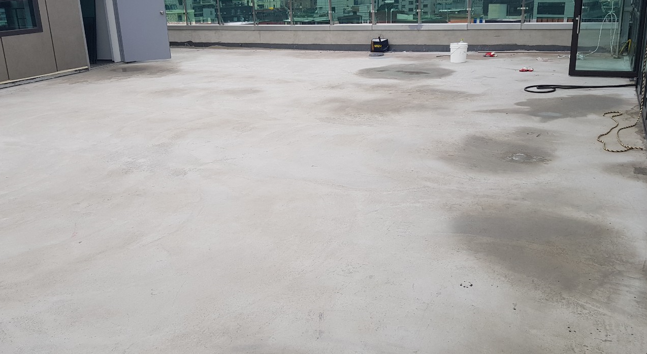 현재 옥상 바닥의 상태는 콘크리트 맨바닥인 것을 볼 수 있습니다. 이대로 복합방수를 시공하기엔 어려우므로 밑작업을 진행한 후 본격적인 작업을 시작합니다. 밑작업으로 바닥을 간단하게 정리하고 물청소 작업을 진행합니다.
