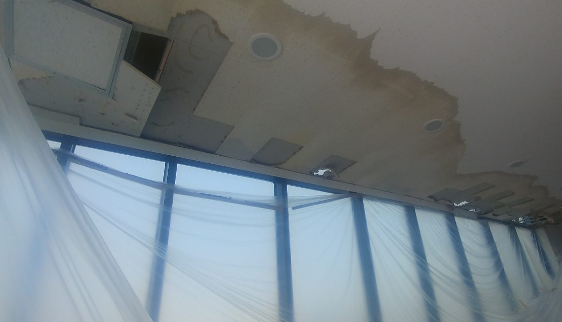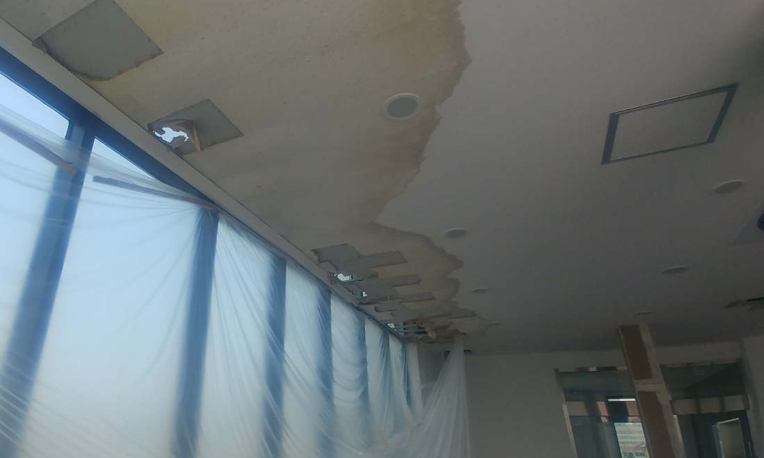 누수로 인해 하자가 발생한 천장의 모습입니다. 옥상에 생긴 크랙으로 물이 들어가게 되면 그대로 하자로 이어지는 경우가 많습니다. 하자를 해결하기 위해서는 크랙을 잡는 것이 급선무입니다.