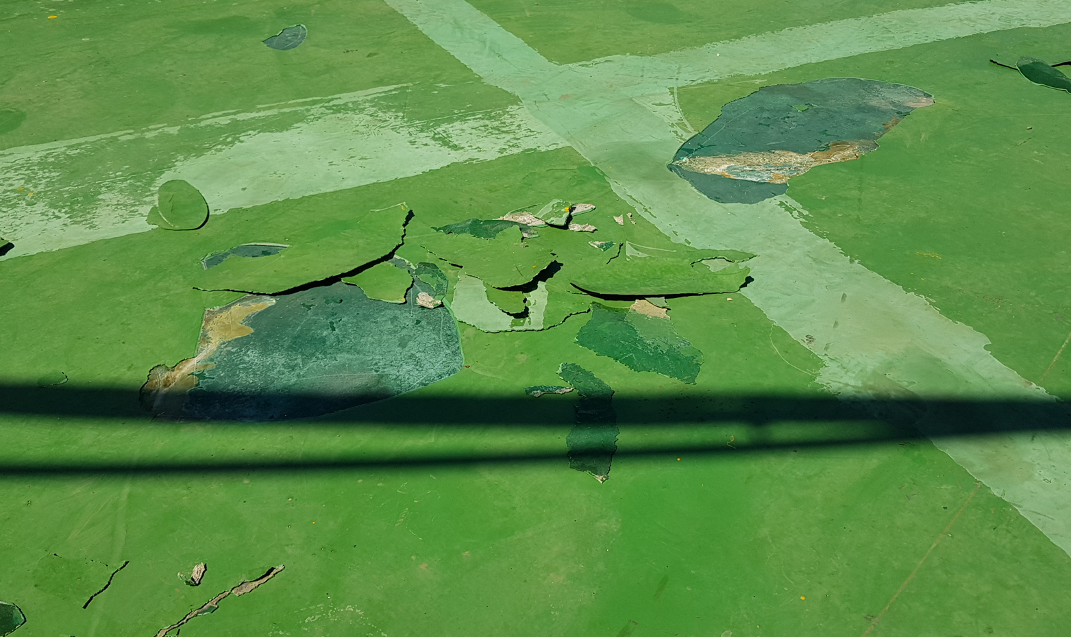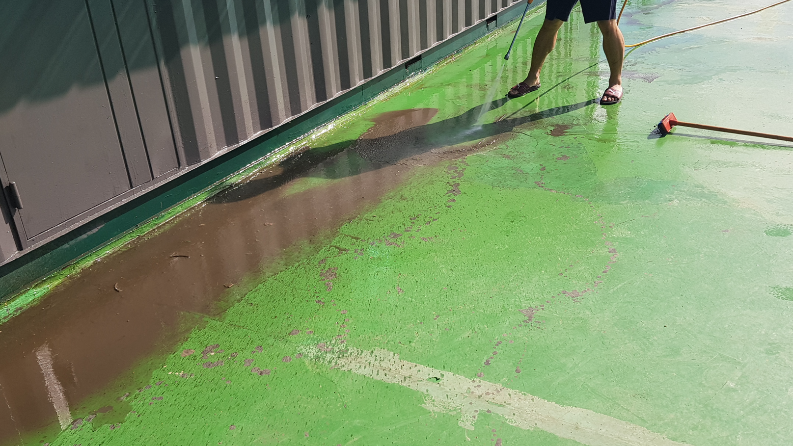 크랙을 확실하게 잡기 위해 이곳에는 복합시트방수를 시공할 것입니다. 먼저 시공에 들어가기 전에 바닥을 정리해야 합니다. 쓸 수 있는 바닥은 그대로 두고 하자가 심한 부분은 제거합니다. 바닥 정리와 함께 물청소도 진행합니다.