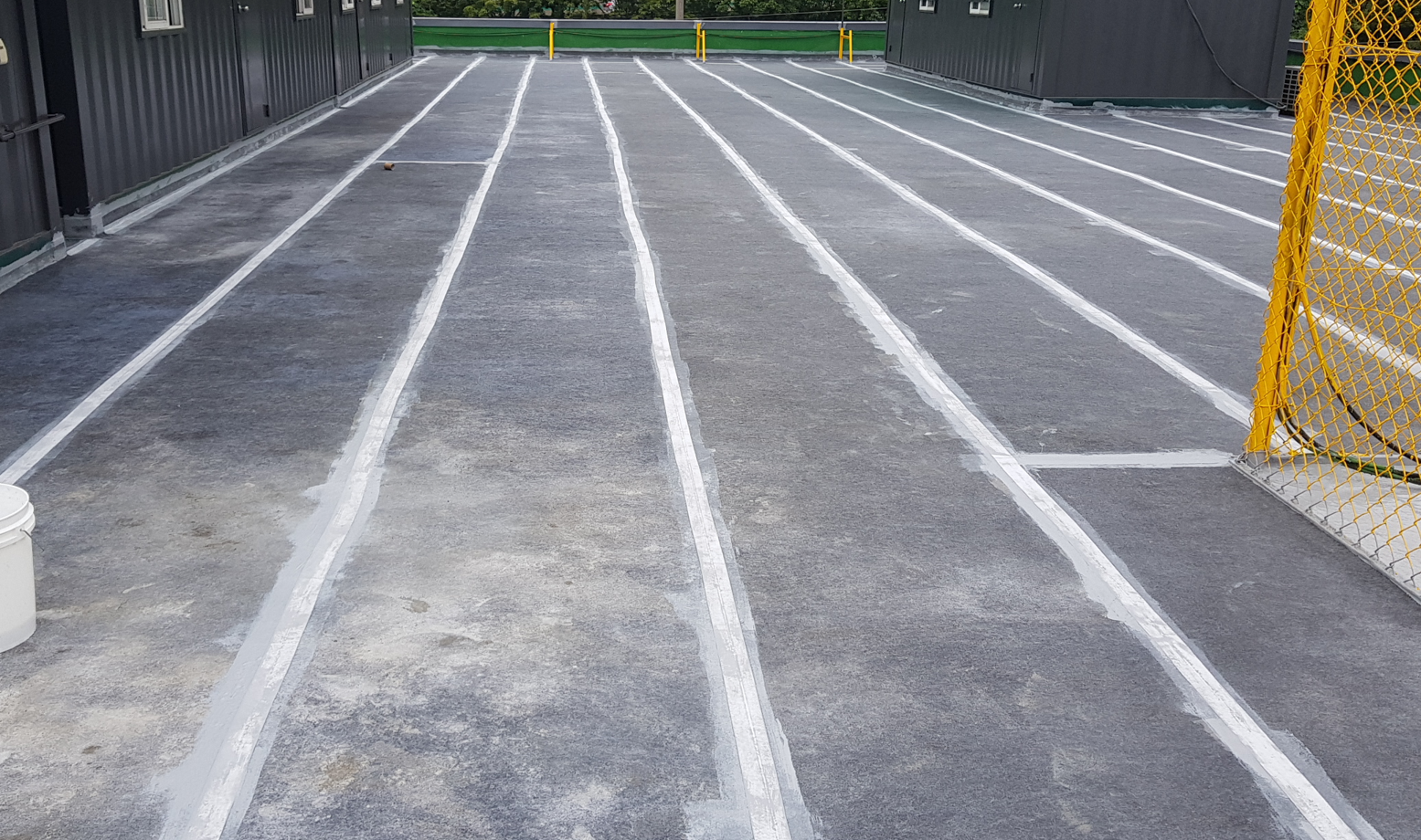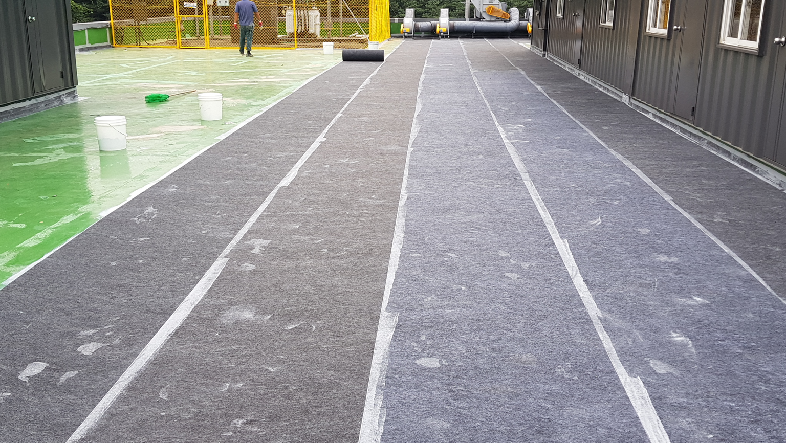 이번엔 바닥 전체에 시트를 부착할 차례입니다. 우레탄으로 해결하지 못한 크랙을 완벽하게 잡기 위한 작업입니다. 섬유 재질의 방수시트가 크랙이 다시 갈라지지 않도록 단단하게 고정하는 역할을 합니다. 방수액을 먼저 칠한 후 시트를 부착하여 작업합니다.