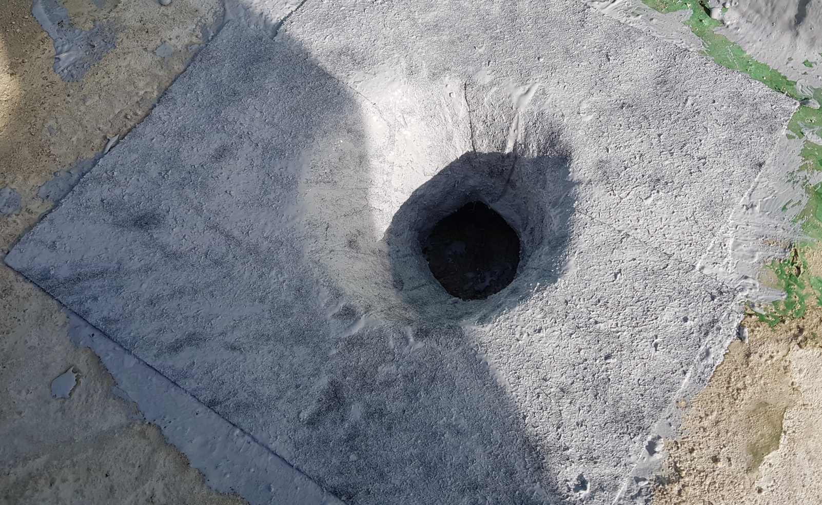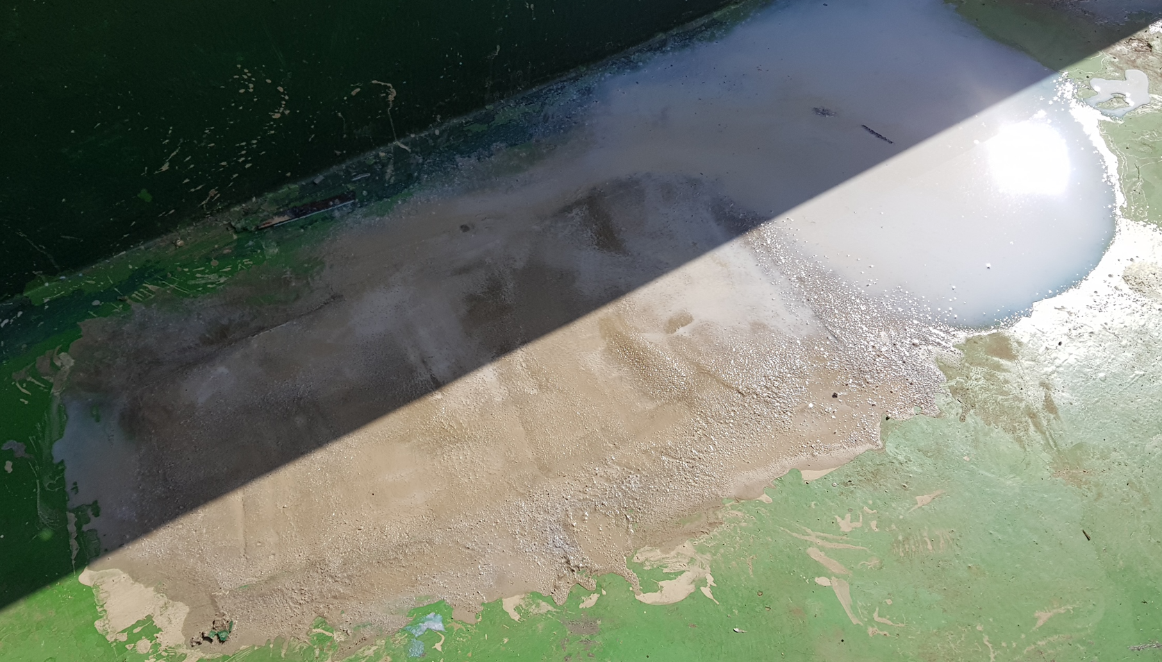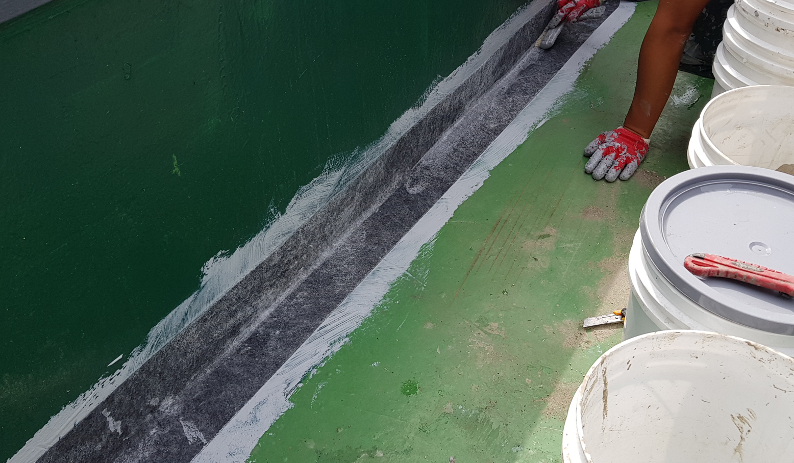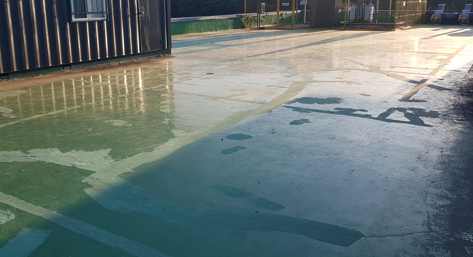 바닥이 파여 단차가 있는 부분에는 미장 작업을 합니다. 이후 진행할 시트 작업을 위해 바닥을 평평하게 만드는 과정입니다. 미장은 침투 방수액과 몰탈을 적절하게 혼합한 것을 가지고 작업을 진행합니다.