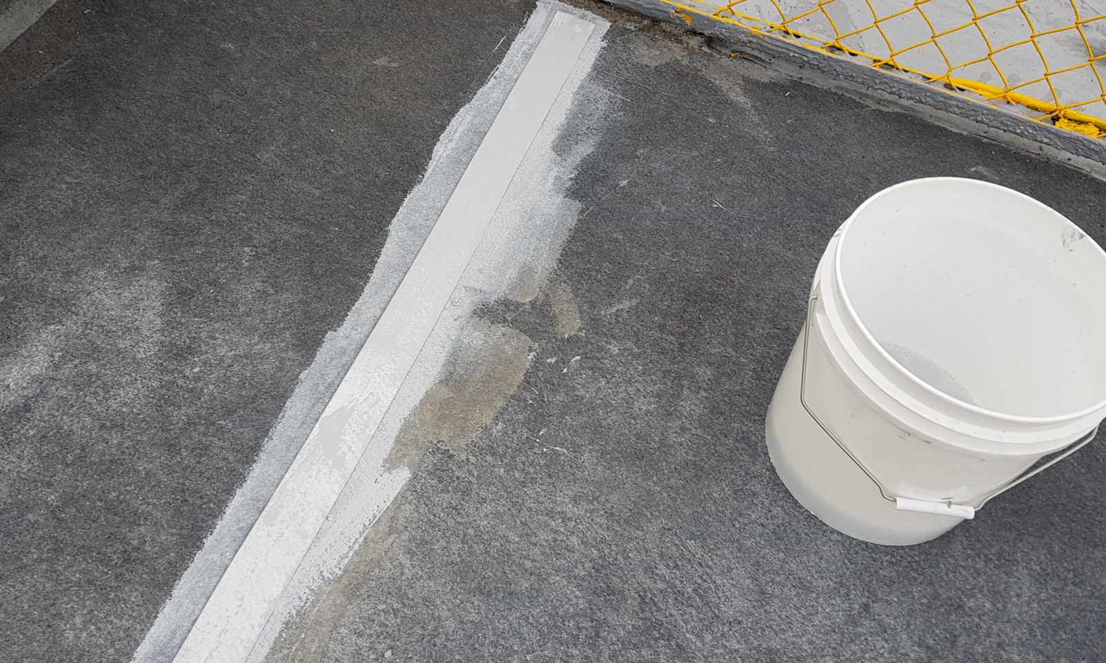 옥상의 우수관과 벽체의 조인트 부분은 하자가 쉽게 발생하는 부분입니다. 이렇게 누수에 취약한 부분에는 기초 시트 작업을 진행합니다. 기초 시트 작업은 방수액과 방수시트로 다른 곳보다 한 번 더 보강하는 작업입니다.