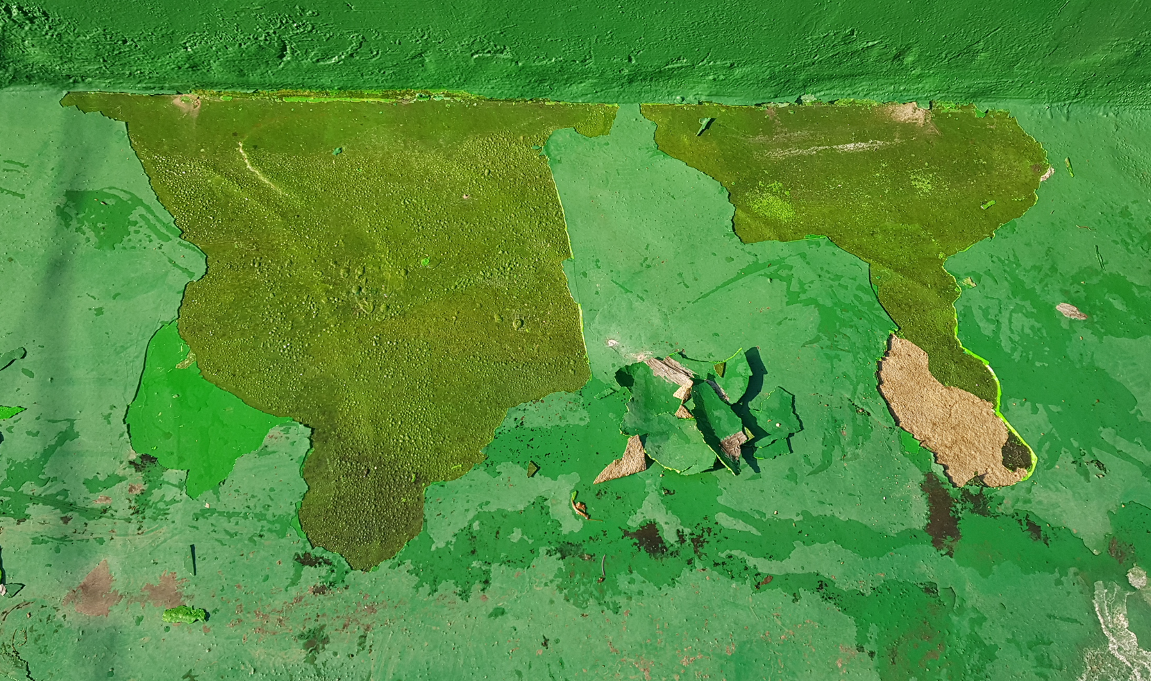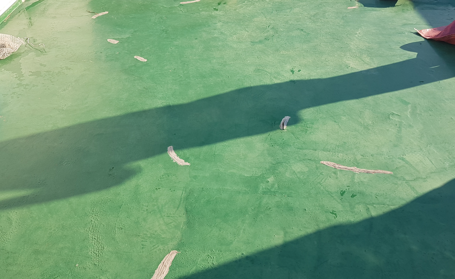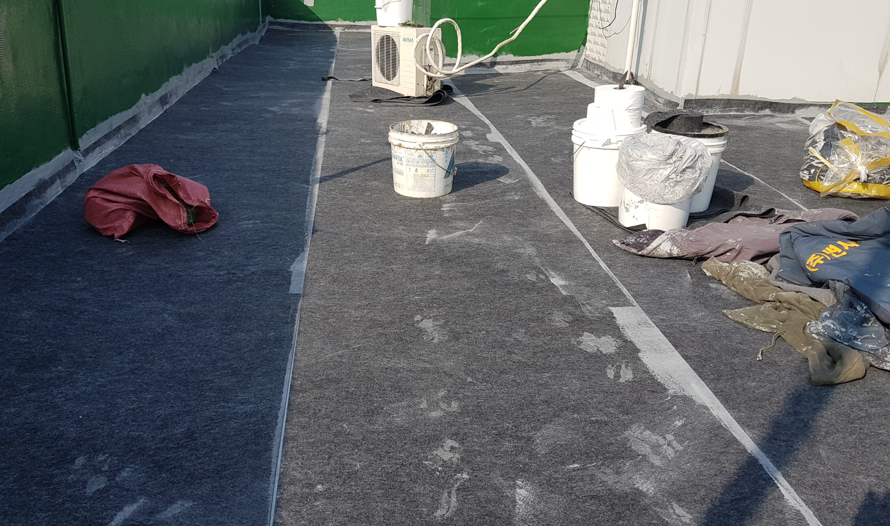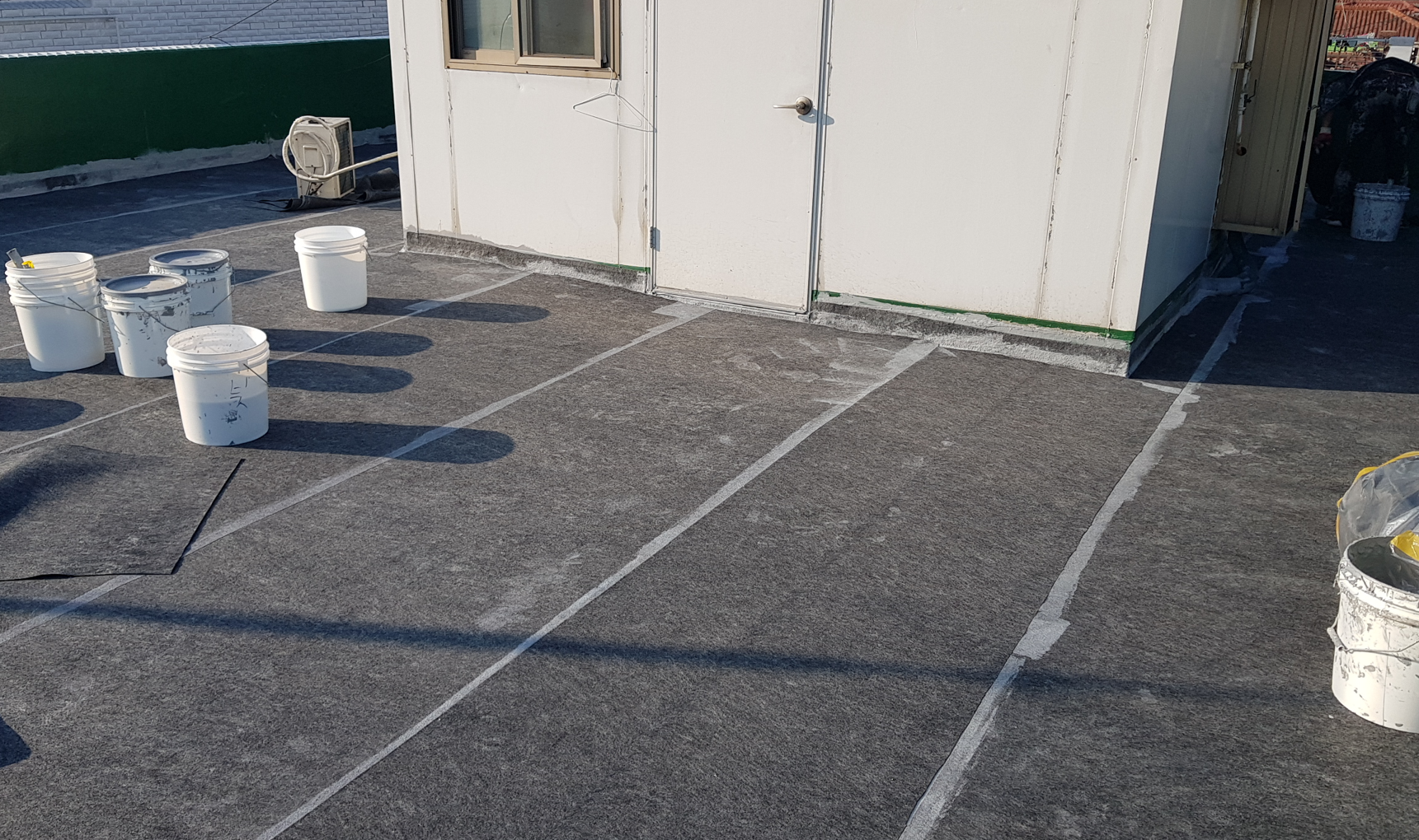 프라이머와 기본적인 시트 작업을 마친 후 바닥 시트 작업에 들어갑니다. 방수액을 먼저 칠한 후 방수시트를 바닥 전체에 부착하는 작업입니다. 친환경 자재를 사용하기 때문에 호환성이 좋아 우레탄과도 잘 맞기 때문에 문제가 없습니다. 방수시트의 역할은 크랙을 고정해 다시 갈라지지 않도록 만드는 것입니다.